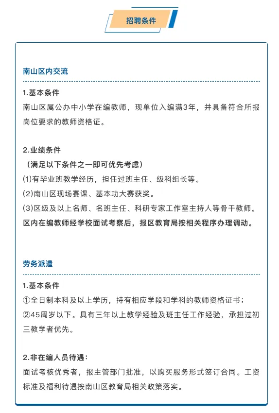 本次招聘岗位涵盖中考、会考各学科。招聘类型分为:南山区内交流和劳务派遣。对应设置明确准入条件,录用人员按规定享受对应薪酬待遇。