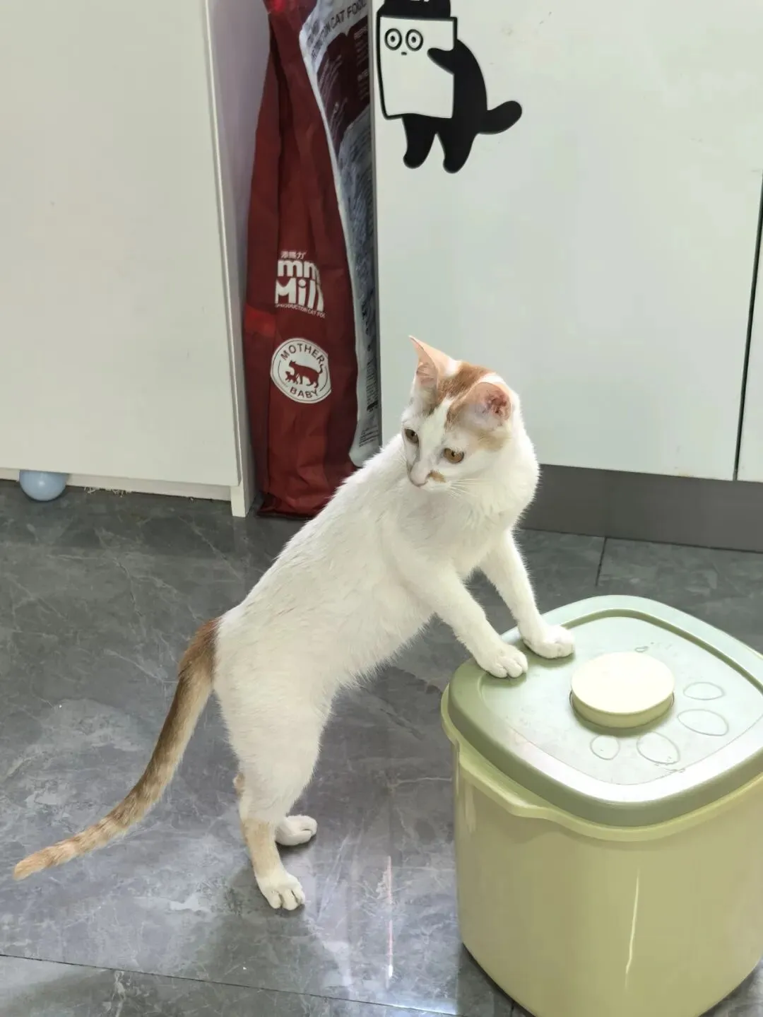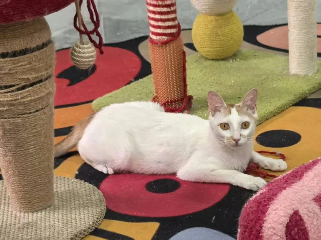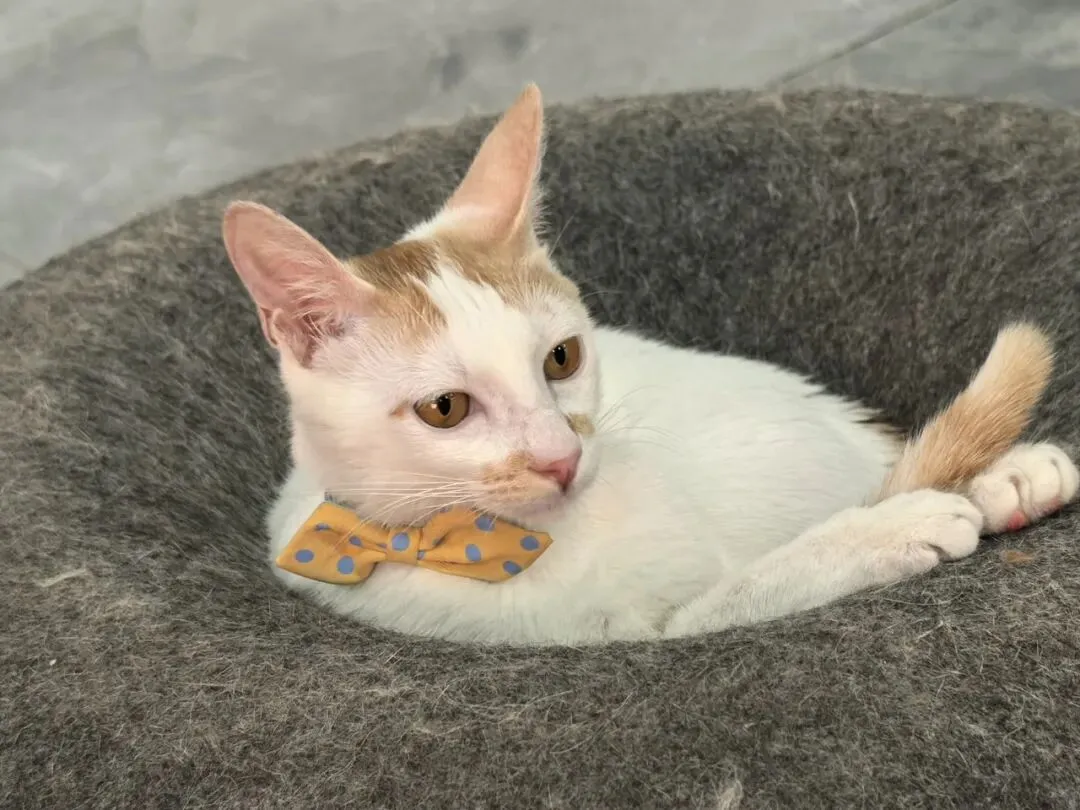 这是特别的橘白,兼具橘猫的憨和白猫的灵,毛色特别,头顶、尾巴和嘴侧有黄色,身体则呈白色。