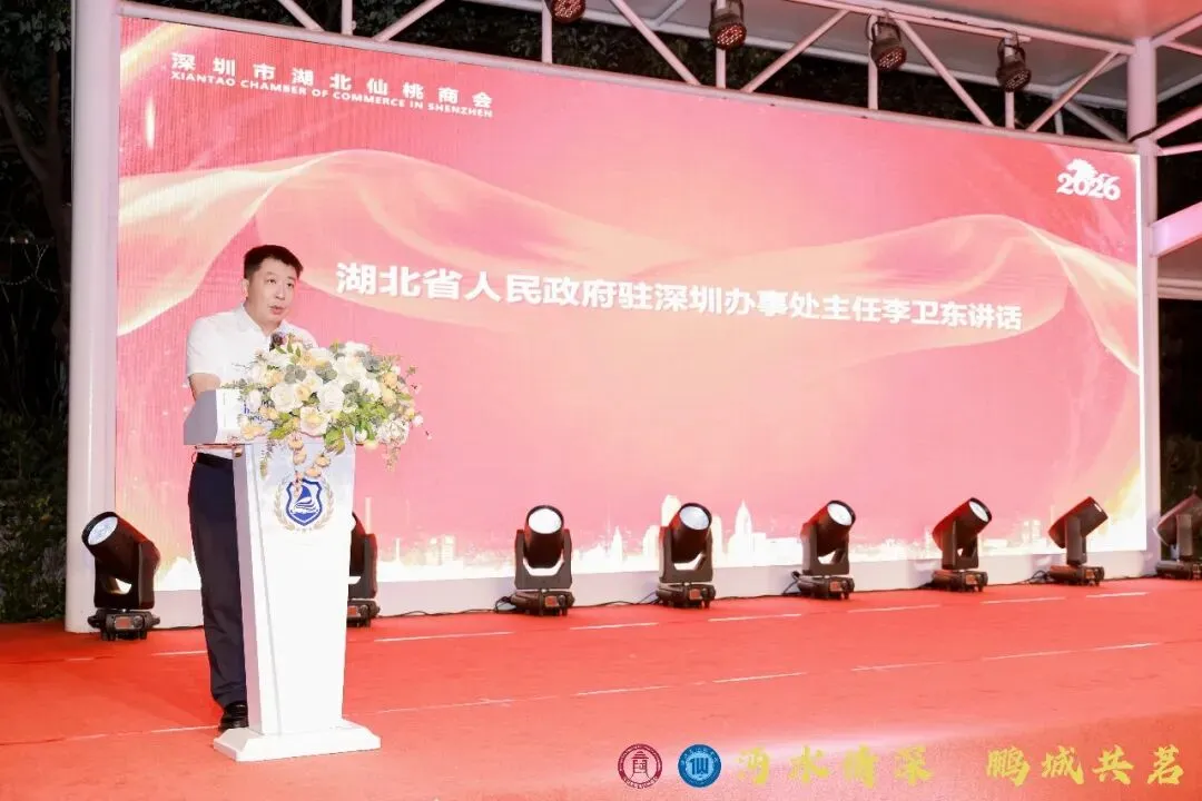 湖北省人民政府驻深圳办事处主任李卫东致辞,对盛会圆满举办表示热烈祝贺,高度肯定商会在服务会员、招商引资、深仙联动等方面的突出贡献。他希望商会坚守初心使命,做实产业研究、楚商服务、红色传承三大工作,推动产业回归、校友回归,搭建政企沟通、项目对接、诉求解决的高效平台。驻深办将持续与商会同心同行,构建支持楚商回乡、校友回归的良好生态,凝聚乡贤智慧力量,助力湖北与深圳协同发展,彰显新时代楚商担当作为。