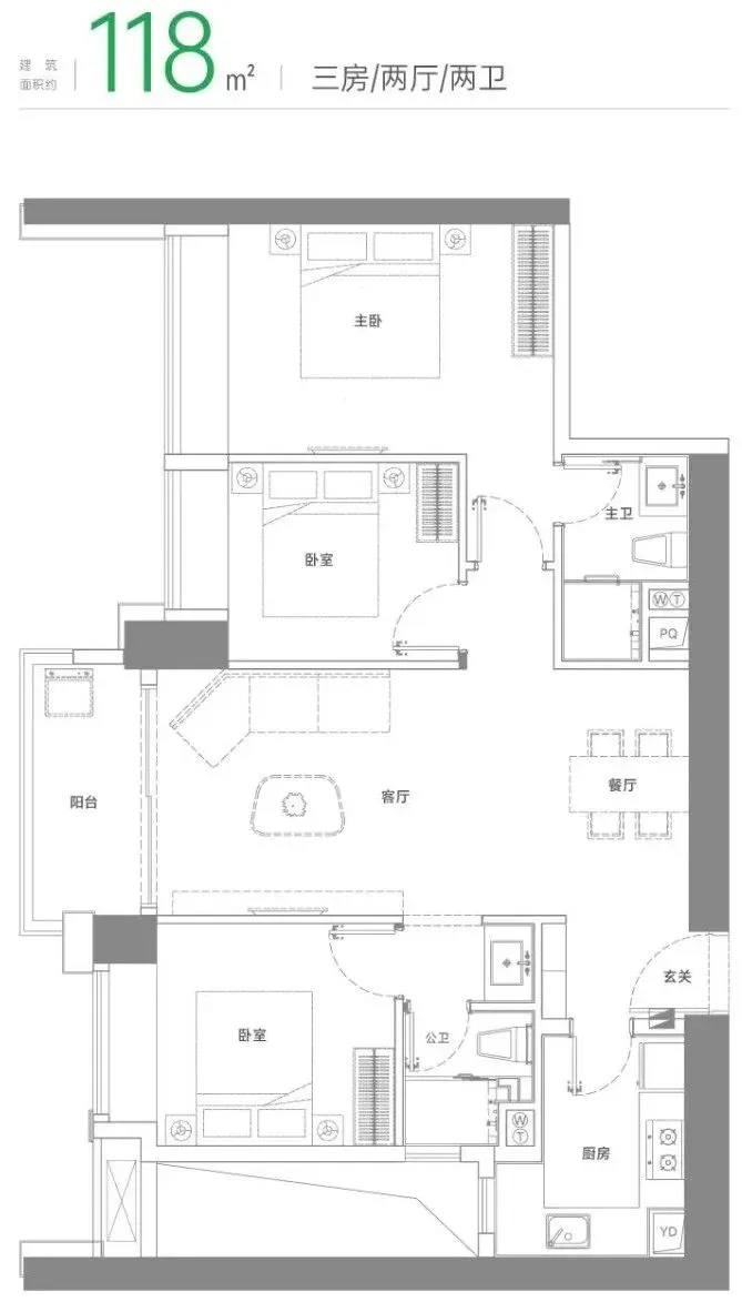 建面约118㎡三房两厅两卫