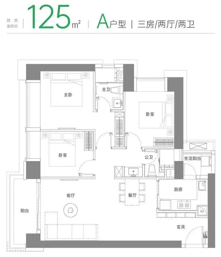 A户型 建面约125㎡三房两厅两卫