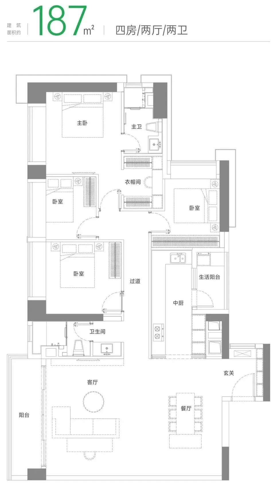 建面约187m² 四房两厅两卫