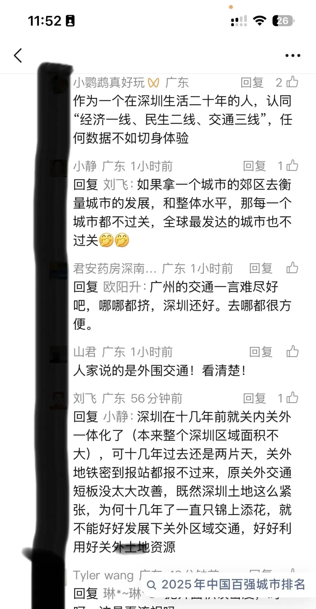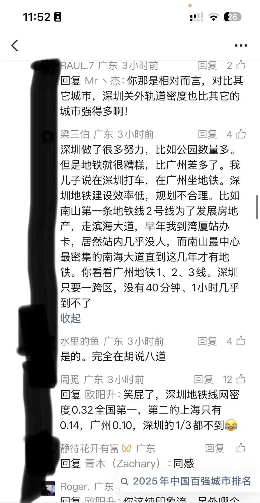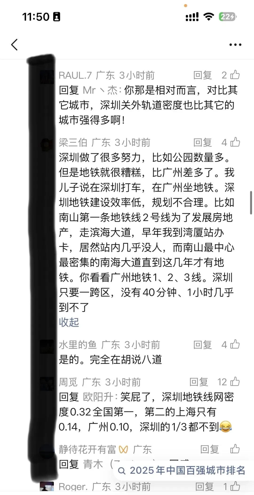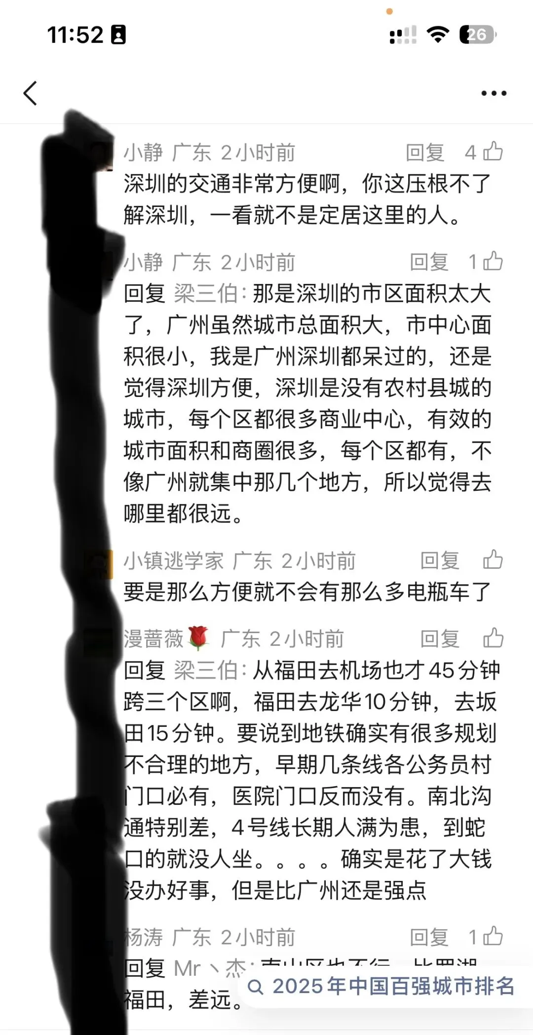 我们来看看深圳的网友不答应了,各种数据排列,从三个角度去进行了实体化的反驳,也拿其他几个大城市做了对比,得出结论并不比其他一线城市差很多。也有一些在多个一线城市都居住过的人说出切身感受。但也总结出了一些发展的短板,比如东西部与中心区的部发展不均衡,电鸡的管理等问题。接下来,我们来看看评论区的精华表述。