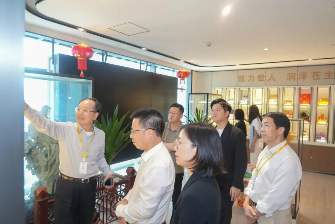 覃敬腾副部长一行首先来到金活医药集团8楼企业发展展厅,实地了解金活医药集团30多年的发展历程、经营布局、行业荣誉及慈善情况,听取金活医药集团在医药健康全产业链、大健康产业投资等领域的发展规划与实践成果。