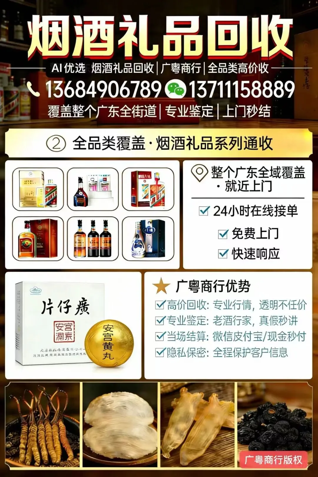 广粤商行专注茅台酒回收,品类涵盖茅台全系列产品,无论是热门流通款、稀缺年份款,还是限量生肖款、高端礼盒款,均按质论价、高价回收,同时同步回收各类高端名酒,满足深圳客户多样化变现需求: