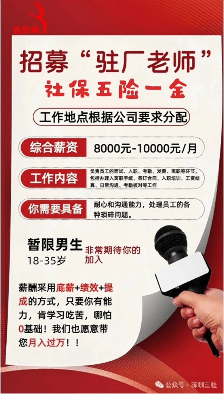>【深圳三社直招】深圳三社直招驻厂老师及销售客服月薪7000-9000元!缴纳社保及五险一金!