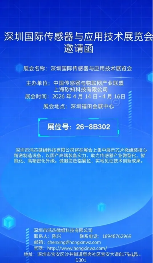 感知万象,智创未来。2026 第四届深圳国际传感器与应用技术展览会(Sensor Shenzhen 2026) 将于4 月 14 日 - 16 日在深圳会展中心(福田) 盛大启幕。作为深耕亚微米级芯片微组装与先进封装领域的国家高新技术企业,深圳市鸿芯微组科技有限公司(展位号:26-8B302)将携旗下核心设备重磅亮相,以百纳米级精密贴装、晶圆级键合技术,为 MEMS 传感器、光电子器件、先进半导体封装提供一站式高精度工艺解决方案,诚邀业界同仁莅临展位、共探商机!