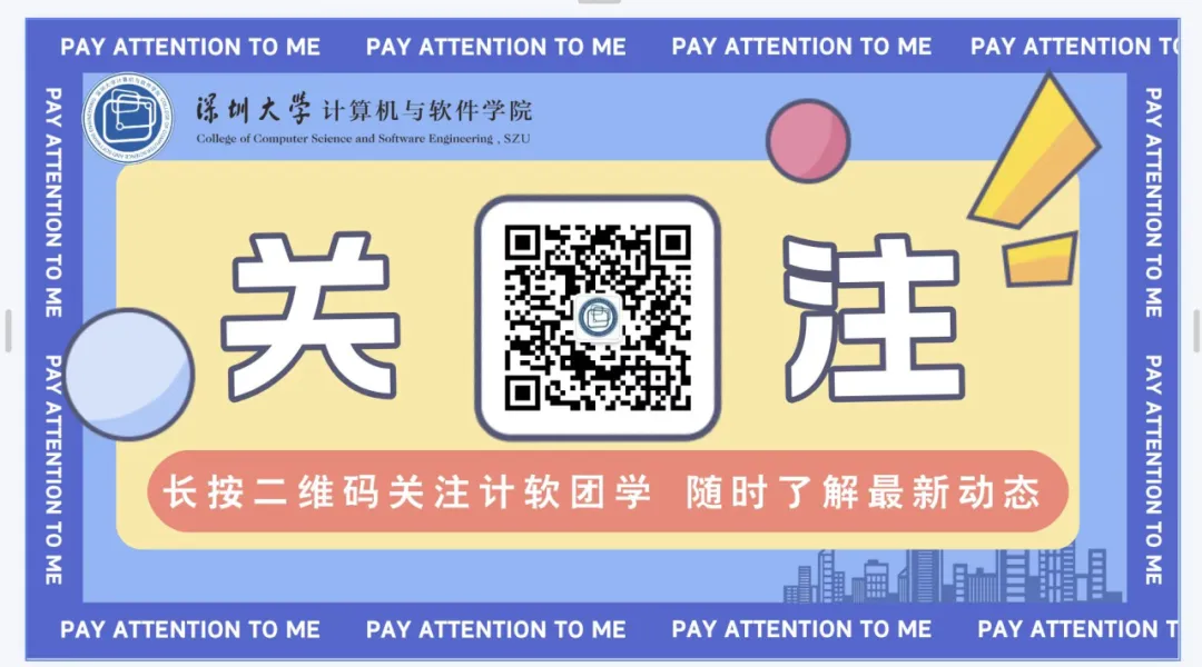 本微信公众号所有内容,由深圳大学计算机与软件学院自身创作、收集的文字、图片和音视频资料,版权归属深圳大学计算机与软件学院所有;从公开渠道收集、整理及授权转载的文字、图片和音视频资料,版权归属原作者。如原作者不愿在本公众号刊登,请通知本号,予以删除。