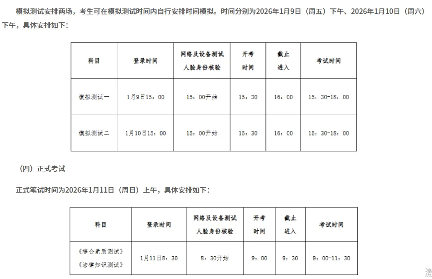 4.笔试:2026年1月11日上午,在线进行,科目为《综合素质测试》与《法律知识测试》。