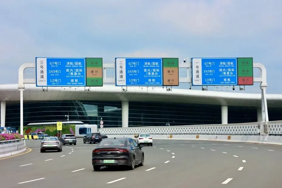在离港平台的高架桥上,共设置了三处智慧引导屏——