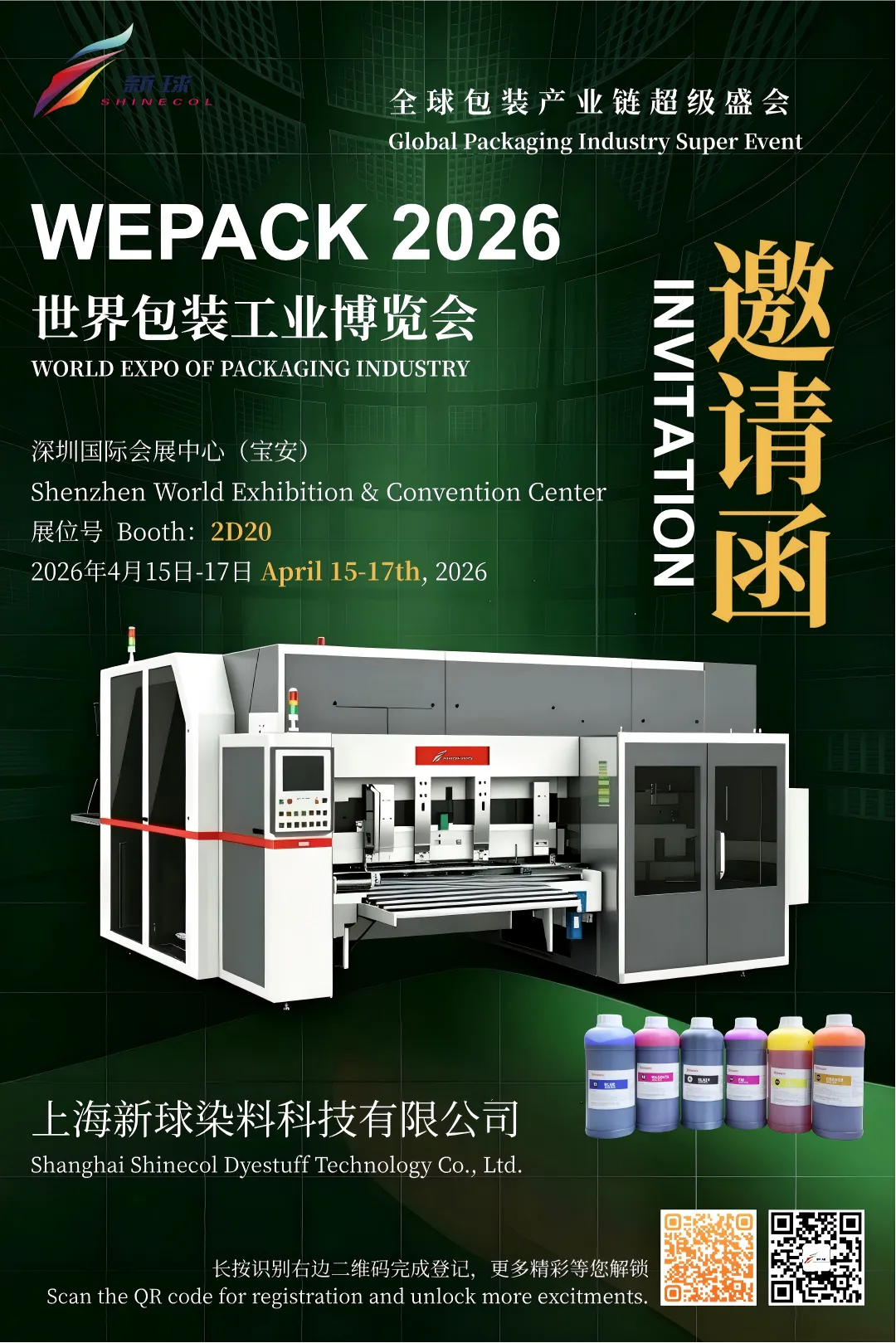 We sincerely invite you to meet us at the 2026 WEPACK World Packaging Industry Exhibition (April 15–17, 2026) — visit our booth 2D20! Shanghai Shinecol Dyestuff Technology Co., Ltd. will bring a full range of innovative products and solutions to the show, and we can’t wait to connect with you, discuss cooperation, and build a better future together.