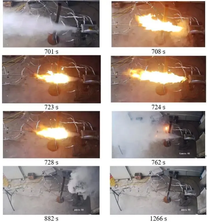 (2) 热失控阶段。开始加热后701 s,电芯内部可燃气体压力达到上限,气体冲破安全阀向外喷出,喷射距离超过2 m。708 s时,可燃气体被点燃,形成射流火焰。火焰长度在60~70 cm之间变化。