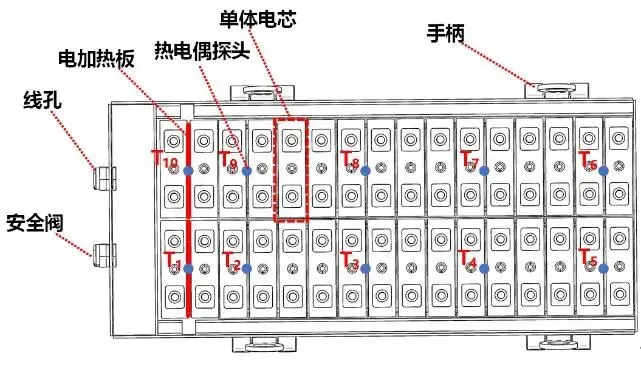 图6所示为10 kWh电池模组的内部结构示意图。电池模组内部包含32个单体电芯,以2排16列的方式排列,单个电芯规格与前述实验所使用的电芯相同。电池模组标称电压为51.2 V,标称容量200 Ah。在每排电芯的一侧各放置1块900 W电加热板,通过诱发局部电芯的热失控,引燃整个电池模组。在电池模组内部不同区域共布置10支热电偶(T1~T10),监测热失控在多个电芯之间的传播过程。在电池模组的侧面分别开设了线孔及安全阀,电加热板及热电偶探头的导线经过集束后从线孔穿出,利用玻璃纤维及高温锡箔胶带对线路进行包裹,确保线路在高温状态下不会被损坏。