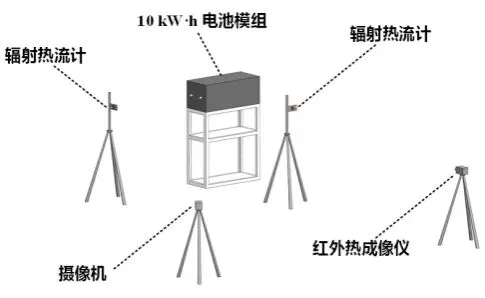 在电池模组热失控实验中,多块电芯热失控叠加作用下形成的喷射火特性,以及电池模组内部电芯的热失控传播规律是关注的重点。搭建了如图5所示的实验场地,在电池模组安全阀正面及侧面1 m处分别布置辐射热流计,监测喷射火对环境热流场的影响。在电池模组远端分别布置摄像机及红外热成像仪,监测电池模组热失控发展过程。由于电池模组火灾规模较大,选取空旷平坦、周围无可燃物的室外空间作为电池模组实验场地。