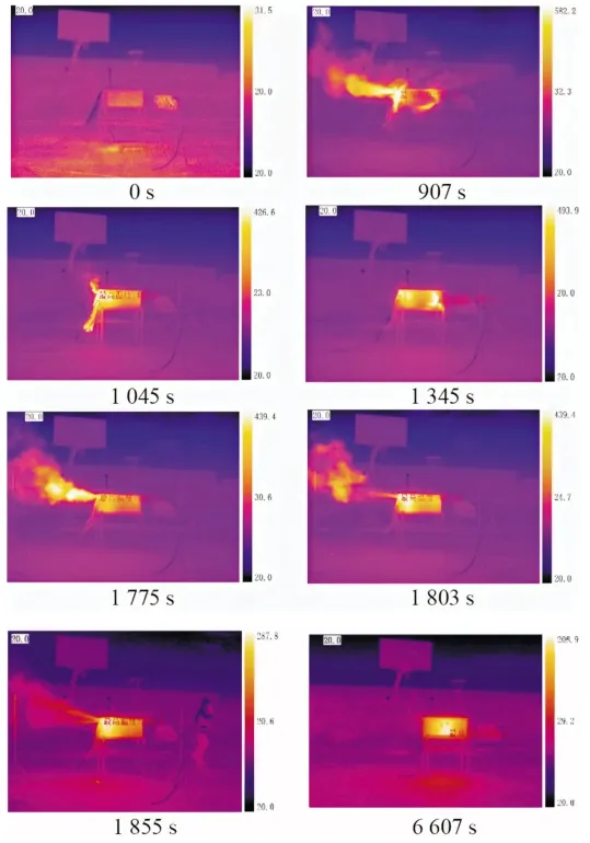 如图7所示,利用红外热成像仪记录了电池模组的热失控过程。与单体电芯的热失控过程类似,电池模组的热失控发展过程同样可分为以下几个阶段: