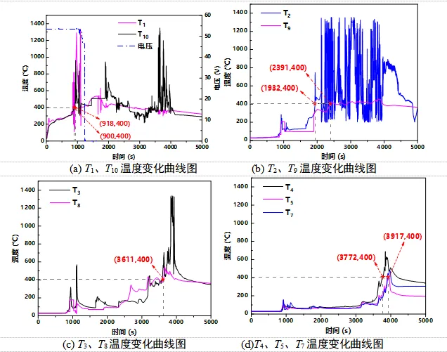 图8所示为电池包电压及内部温度变化曲线图,其中,热电偶T6在实验过程中损坏。从图中能够发现,电池包内部整体温度较高,部分点位最高温度超过了1300℃,说明模组内部存在明火,这主要是由于电芯内部化学物质在高温下分解产生氧气,且外界氧气会沿破裂的安全阀进入箱体,为模组内部空间提供了燃烧条件。