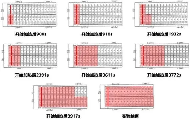 (4) 电池模组内部的热失控蔓延过程以热传导为主,从局部受热处向其他方向呈连续性蔓延,最终蔓延至整个电池模组。横向相邻热电偶所属位置的电芯组平均约900 s才继续失控,导致火灾可持续≥1 h。建议通过子模组化、隔热阻断与定向泄压设计,延长传播间隔或阻止级联。