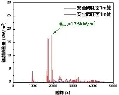 实验过程中的辐射热通量测量结果如图10所示,由于辐射热流计始终未直接接触到火焰,因此测量值较电芯热失控实验有所降低,辐射热通量曲线的峰值数量与喷射火出现的次数相同。安全阀正面1 m处最大辐射热通量值为17.6 kW/m2,此时喷射火长度达到最大值95 cm。安全阀侧面1 m处热流计由于距离火焰较远,最大测量值未超过1 kW/m2。