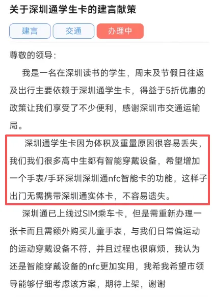 近日,有深圳学生反映称,使用深圳通学生卡出行,携带不便容易遗失。如今很多学生都有智能穿戴设备,希望深圳通学生卡增加一个手表/手环nfc的功能,这样出门无需带实体卡。