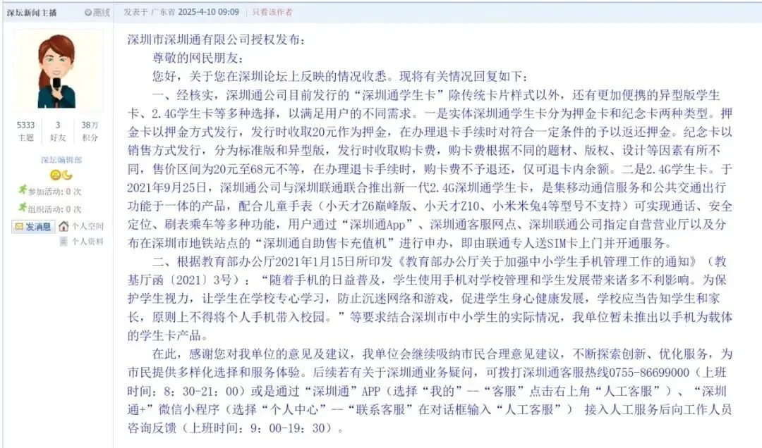当时,针对市民反映的问题,深圳市深圳通有限公司回应表示经核实,深圳通公司目前发行的“深圳通学生卡”除传统卡片样式以外,还有更加便携的异型版学生卡、2.4G学生卡等多种选择,以满足用户的不同需求。