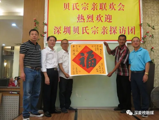深圳贝氏宗亲联谊会会长贝建红、常务副会长贝国浩、副会长兼秘书长贝文生将“福字赠送给印尼坤甸的贝氏宗亲