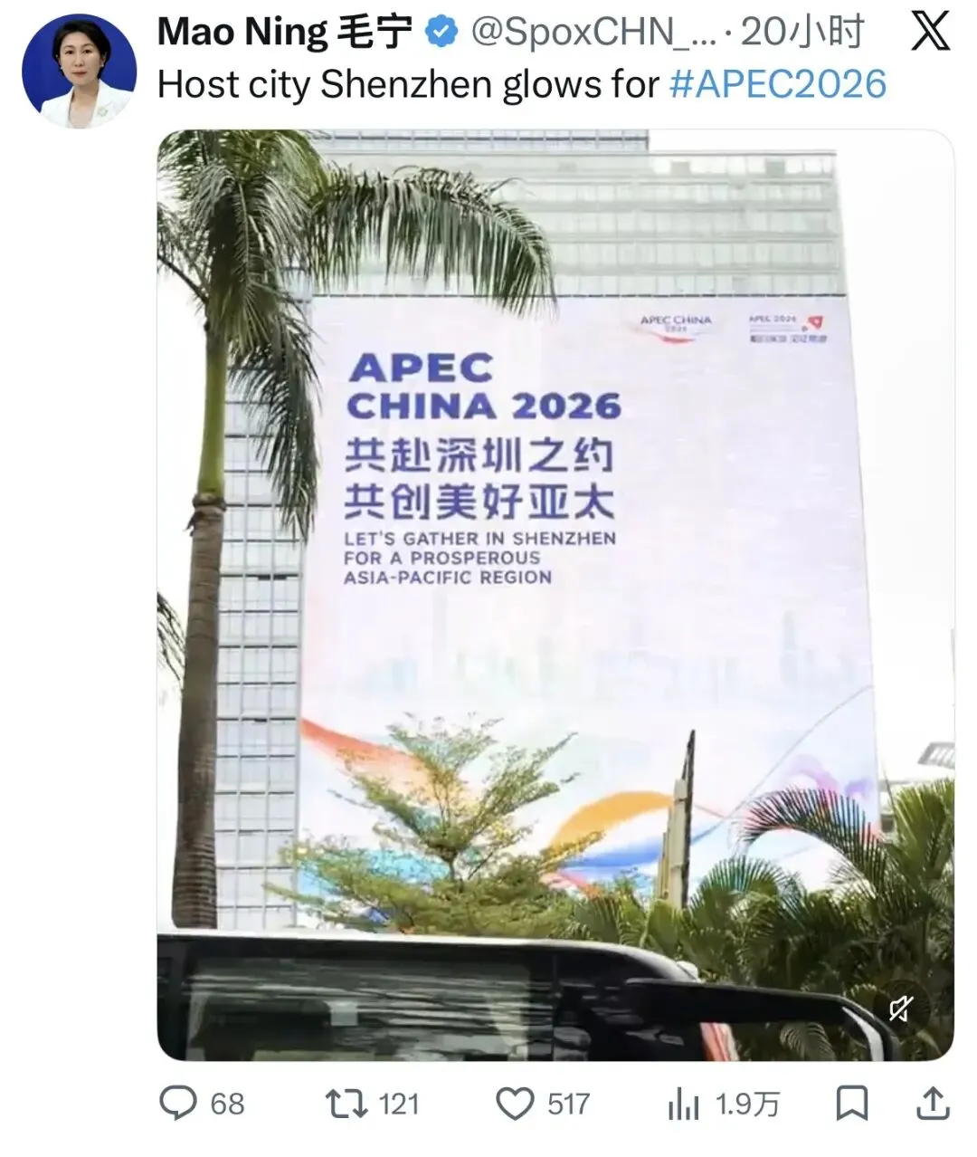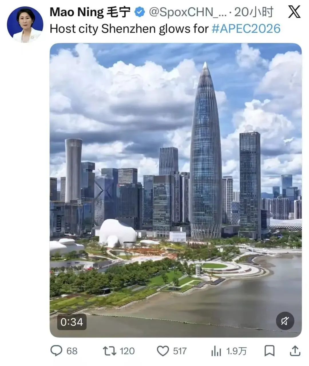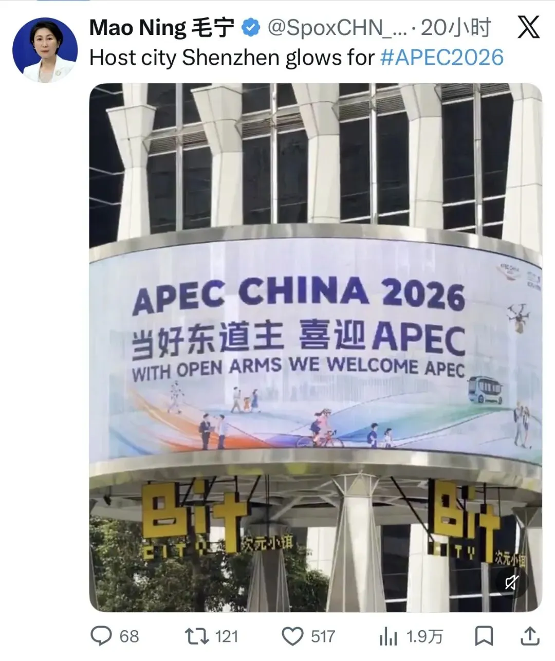 4月12日,外交部发言人毛宁在社交媒体平台X发文:“Host city Shenzhen glows for #APEC2026”,点赞深圳焕发光彩,迎接APEC会议。