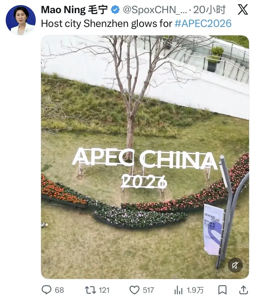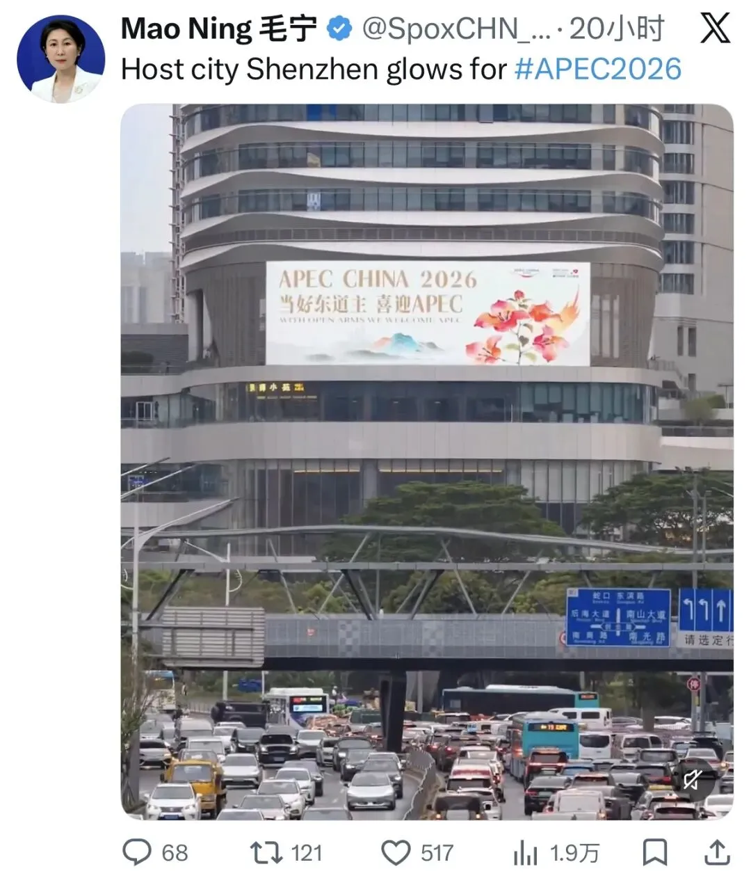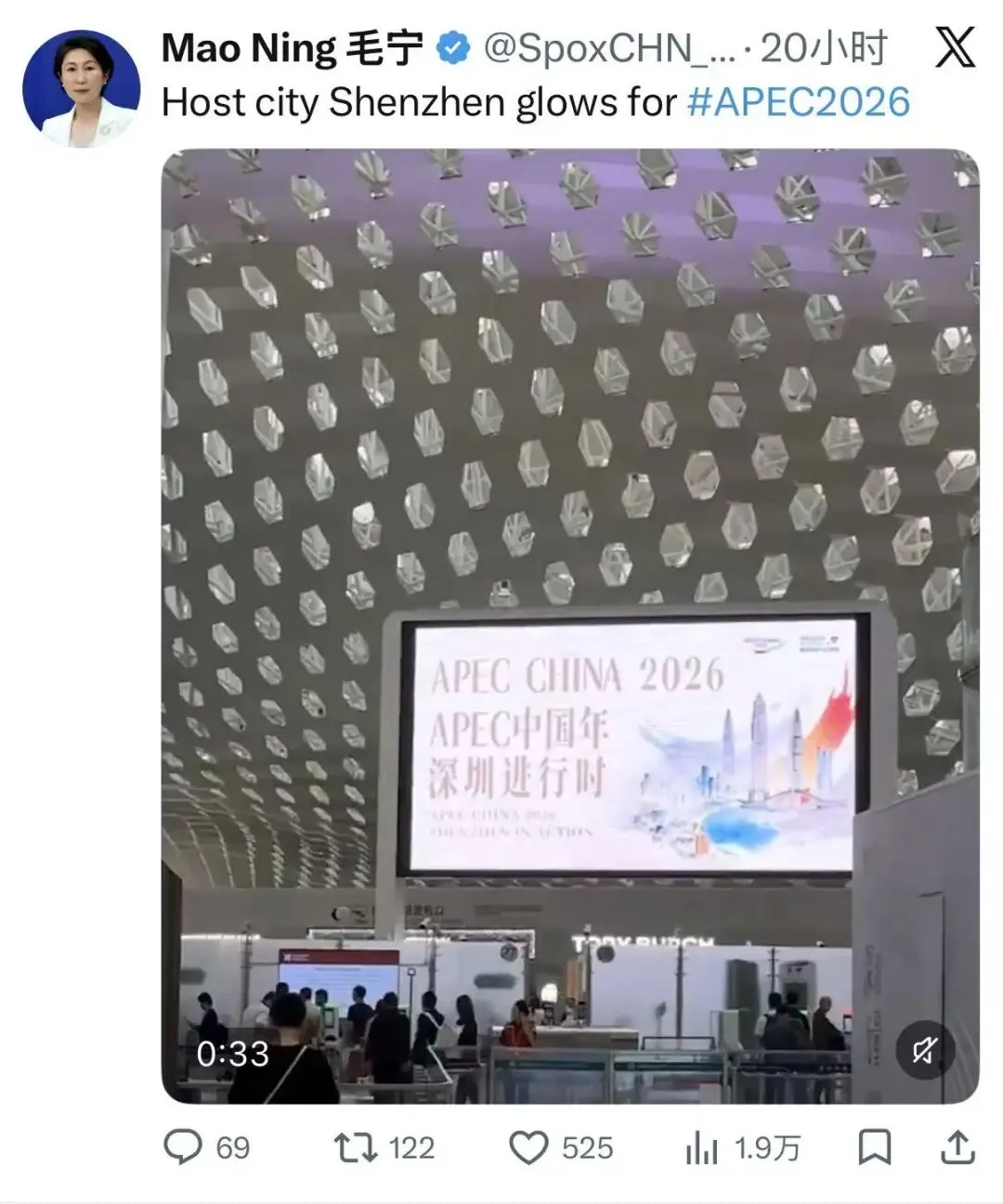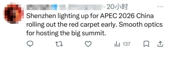 该推送浏览量达1.9万,引发广泛关注,不少海外网友在评论区点赞,表达热切期待。今年11月,亚太经合组织(APEC)第三十三次领导人非正式会议将在深圳举行。毛宁发布的视频中,深圳机场、户外楼宇等多处电子屏亮屏展示APEC主题宣传海报。电子屏滚动播放了“APEC中国年 深圳进行时”“共赴深圳之约 共创美好亚太”“相约深圳 见证奇迹”“当好东道主 喜迎APEC”等主题海报,喜迎APEC氛围浓厚。从城市主干道到机场枢纽,从各大口岸到核心商圈,APEC元素正以可见、可感的方式融入深圳人的日常,这座活力之城已蓄势待发,以饱满的东道主热情静候全球宾朋共赴“深圳之约”。