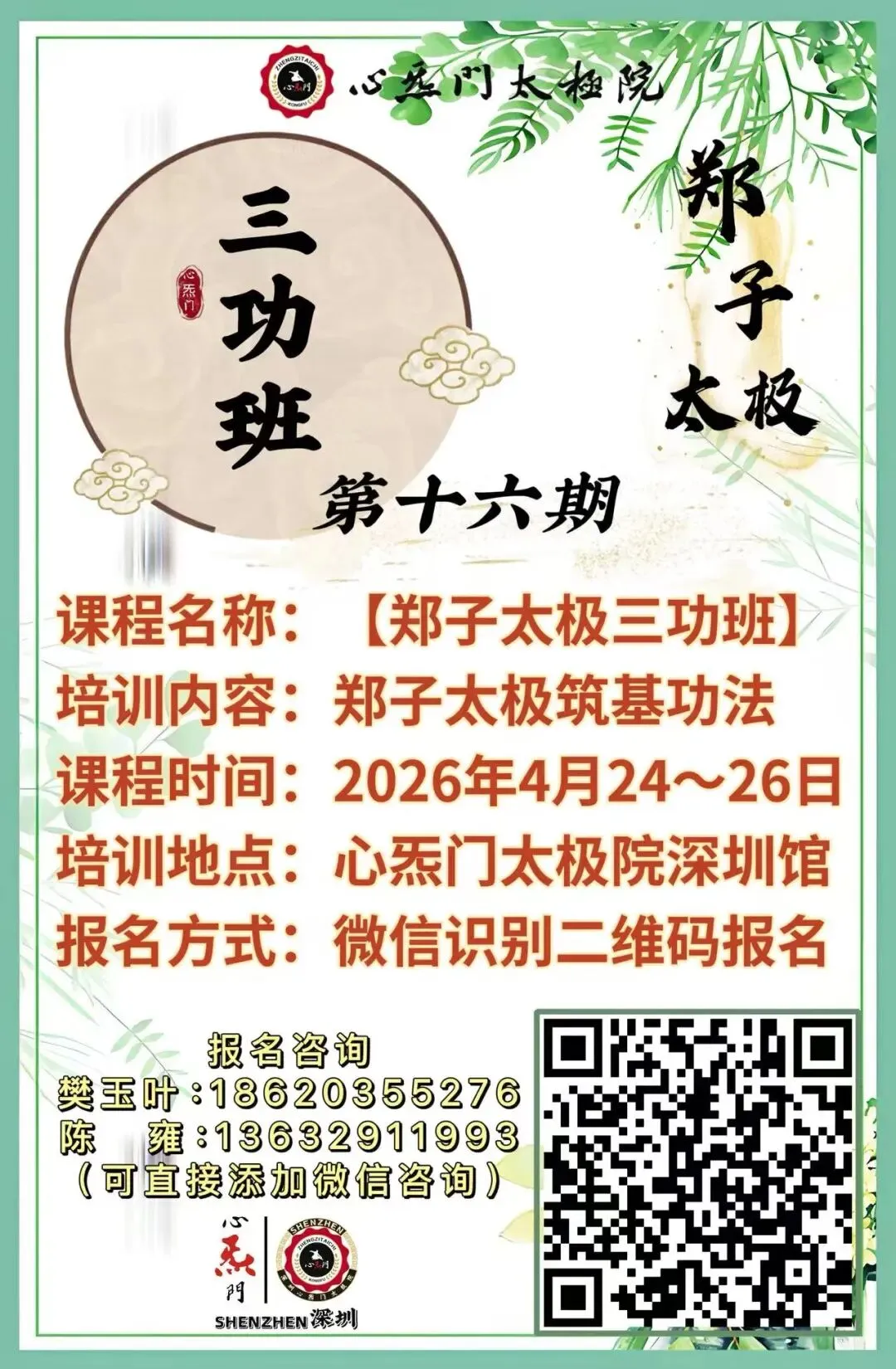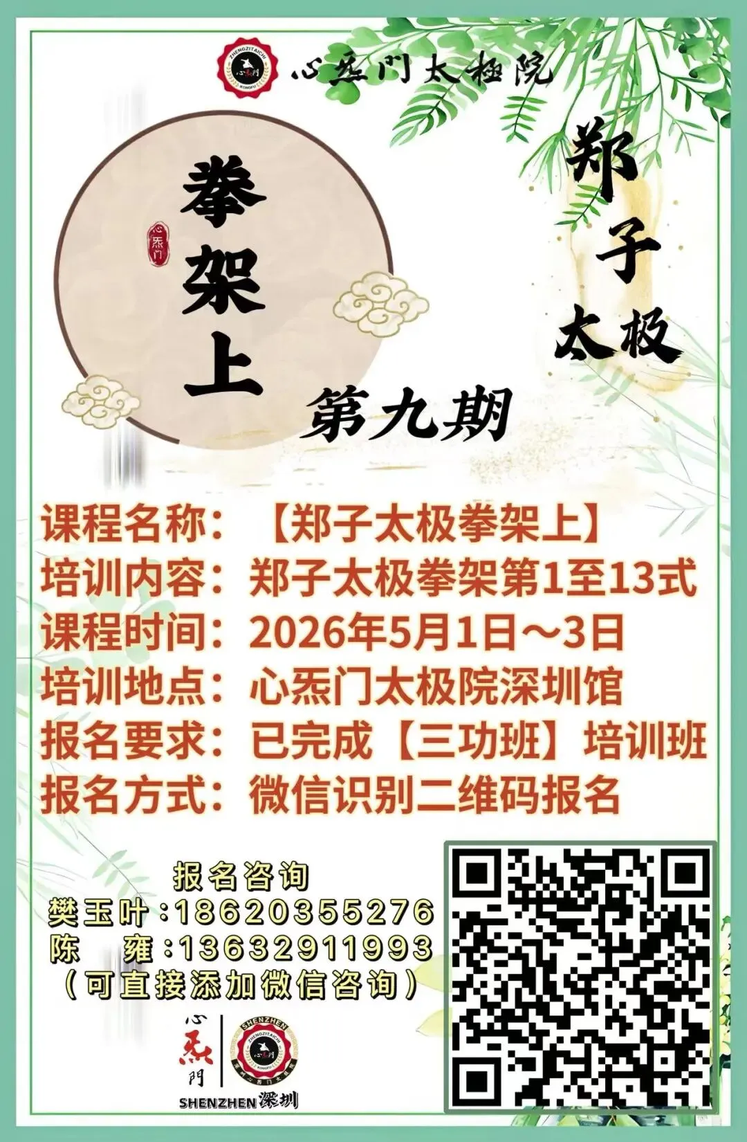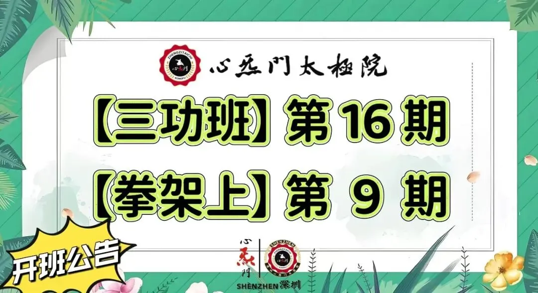 深圳心炁门太极院将于2026年4月、5月开设第16期郑子太极【三功班】、第9期【拳架上】培训班,现报名通道已正式开启!