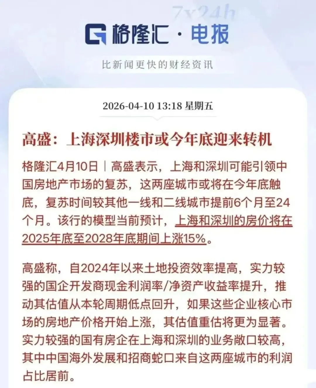 这家国际投行4月10日发了份研报,结论很直接:上海和深圳可能引领中国房地产市场复苏,今年底触底,2025年底至2028年底房价上涨15%。