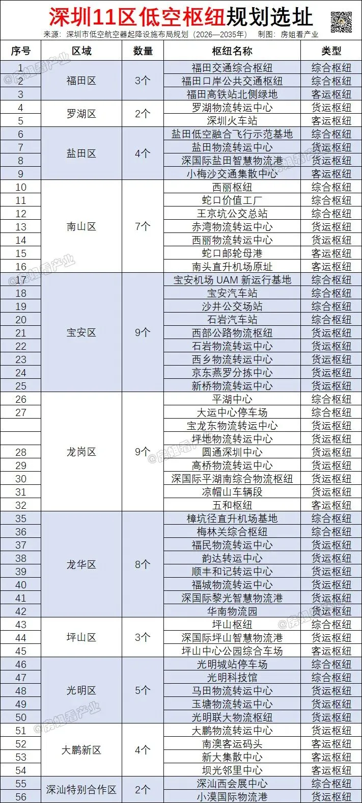 附:深圳56个低空枢纽一览表