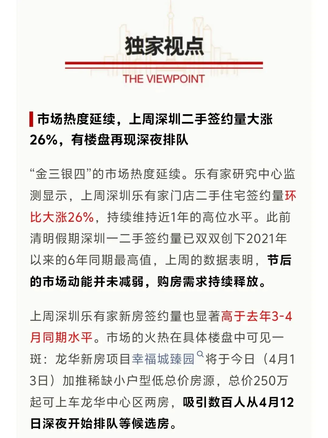 大家好,今天结合最新权威数据与一线市场实况,给大家带来4月13日深圳楼市全景解读,数据真实、观点客观,帮你看清当下行情、把握置业节奏📊✅ 一手住宅:预售网签611套,现售网签471套,合计1082套✅ 二手住宅:累计网签1959套,日均去化超160套✅ 周度爆发:上周二手住宅签约量环比大涨26%,稳居近1年高位✅ 假期纪录:清明假期一二手签约量,双双创下2021年以来6年同期最高节后市场动能完全没有衰减,刚需与改善同步入场,“金三银四”从口号变成真实行情。龙华热门新盘幸福城臻园,4月13日加推稀缺小户型,总价250万起即可上车龙华中心区两房。消息一出,直接引爆市场:与此同时,全市新房整体签约量显著高于去年同期,热点片区来访量持续爆满,刚需盘去化速度明显加快,低总价房源尤为抢手。深港楼市同步回暖,资金、需求、信心形成联动,大湾区核心城市共振效应持续增强,长期看好湾区核心资产价值。🧧 四、全国政策红利:带押过户+交房即交证,买房更省心- 2026年一季度,全国2300多个区县落地“带押过户”全国便民政策落地,进一步激活二手房流通性,对深圳这样的存量房大城长期利好。📊 五、全国热点对比:上海破5年纪录,楼市暖意扩散一线及强二线城市集体回暖,说明本轮行情不是个案炒作,而是政策底+市场底共振下的真实修复,置业信心全面回归。部分楼盘靠降价、低总价、高折扣拉动成交,对周边二手业主形成冲击,普涨行情并未到来,更多是结构性回暖。有行业人士反映,部分开发商把中介当免费推广渠道,却缺乏对等尊重。全城数万中介联动宣传,才能造就高热度,但合作生态仍需完善。当前成交以自住需求为主,投资客大幅减少,市场更健康、更持久,暴涨时代一去不返,稳才是主基调。买房一定要选对板块、选对产品,闭眼买就能涨的时代已经结束。利率低位、政策友好、低总价房源充足,自住不用过度观望,优先选核心片区+流通性强的小户型。“带押过户”降低置换成本,可卖旧买新、卖弱买强,向核心地段、优质物业靠拢。只看租金回报+长期产业支撑,远离远郊概念盘、高溢价伪豪宅。热门片区可适度惜售;冷门片区合理让价,快速变现才是王道。2026年的深圳楼市,正走出温和回暖、结构分化、理性回归的独立行情。二手大涨、深夜抢房、大湾区共振、政策托底,多重利好叠加,但绝不等于盲目追高。后续我会持续更新深圳楼市每日数据、片区测评、新盘解析、政策解读,欢迎关注,一起稳稳买房不踩坑~每日更新笋盘和深圳房产相关,您的点赞与关注,化作我坚持创作的动力*^_^*💝💝💝