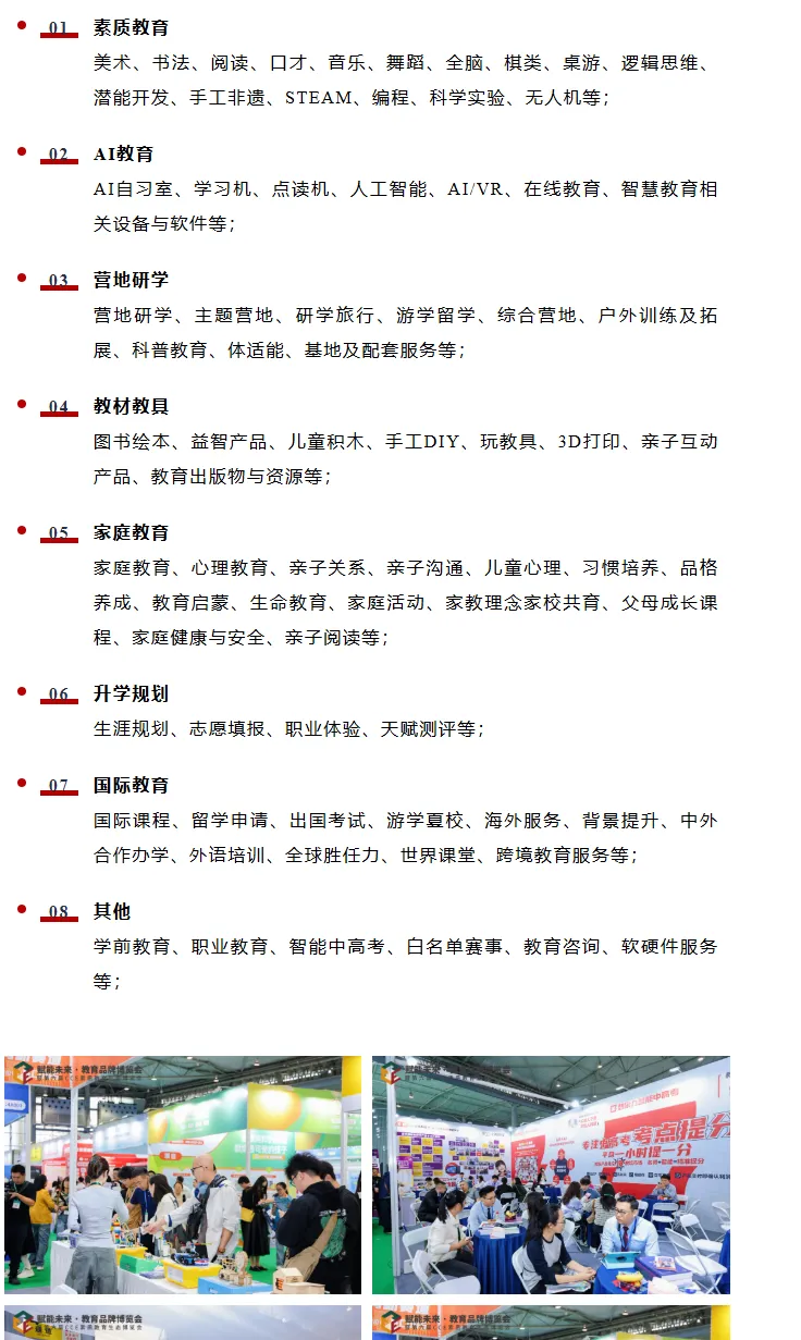 本届展会以“破界·共生”为主题,汇聚素质教育、AI教育、营地研学、家庭教育、国际教育及教材教具全品类,同期举办多场行业论坛。旨在为教育投资人、校长、代理商搭建集品牌展示、趋势洞察与商贸对接于一体的专业平台。