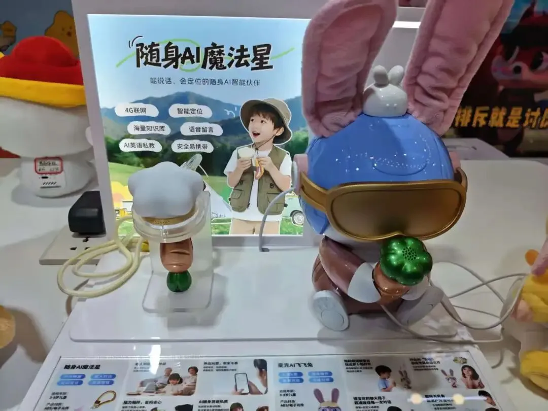 现场展出了随身AI魔法星、麦克AI飞飞兔等产品,两款产品面向3-8岁群体,建议零售价分别是259元与399元。第一款产品采用挂脖设计(下图左侧),支持语音聊天、定位、英语私教等功能。