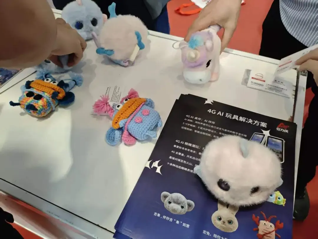 这是一家4G AI玩具解决方案商,(Ps:老板非常健谈。)现场展出了数款毛绒玩具,它们核心亮点包括采用了4G、部分产品配备了眼睛小屏幕,市场指导价非常有性价比,约229-269元。