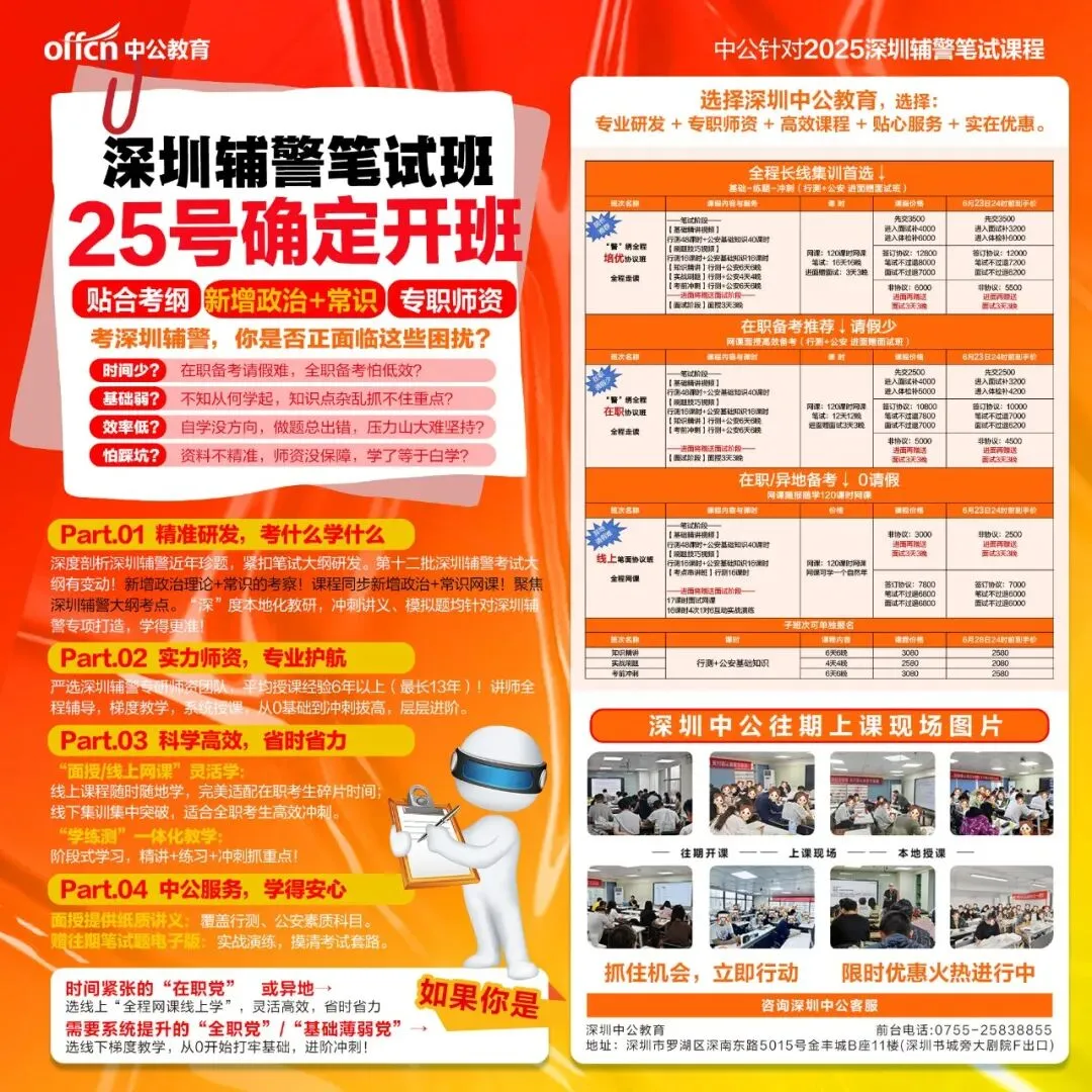 考生如对公告内容及招聘政策有疑问,可通过电话向深圳市公安局进行咨询,咨询电话:0755-82498605;0755-82498905,受理咨询时间:2025年6月20日至7月12日的工作日9:00-12:00、14:00-18:00。以上电话不受理涉及人事考评报名系统、报名信息填写及考务工作等问题的咨询。工作人员仅对公告内容及政策给予解释,不对应聘人员是否符合职位条件进行确认。为避免因咨询电话拥挤而影响报名,考生如有疑问,请先详细阅读公告、应聘指南及职位表等;如仍有疑问,再电话咨询。