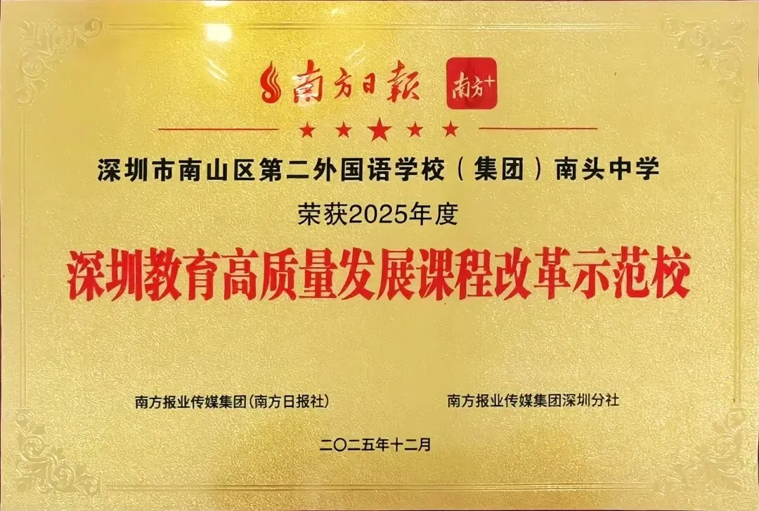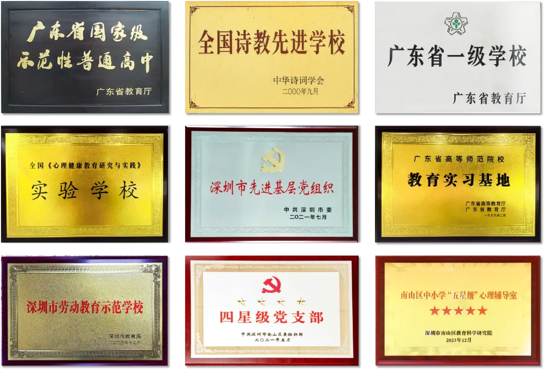 学校是南山区第二外国语学校(集团)的唯一高中,是国家级示范性普通高中(深圳市首批、南山区第一所)、全国诗教先进单位、广东省一级学校、广东省教学水平优秀学校、广东省书香校园、深圳市高中教育教学先进单位、深圳市校园文化特色学校,连续多次获得深圳市高考卓越奖、深圳市办学效益奖、全国示范性校园文学社等荣誉称号或奖励。