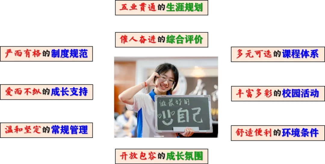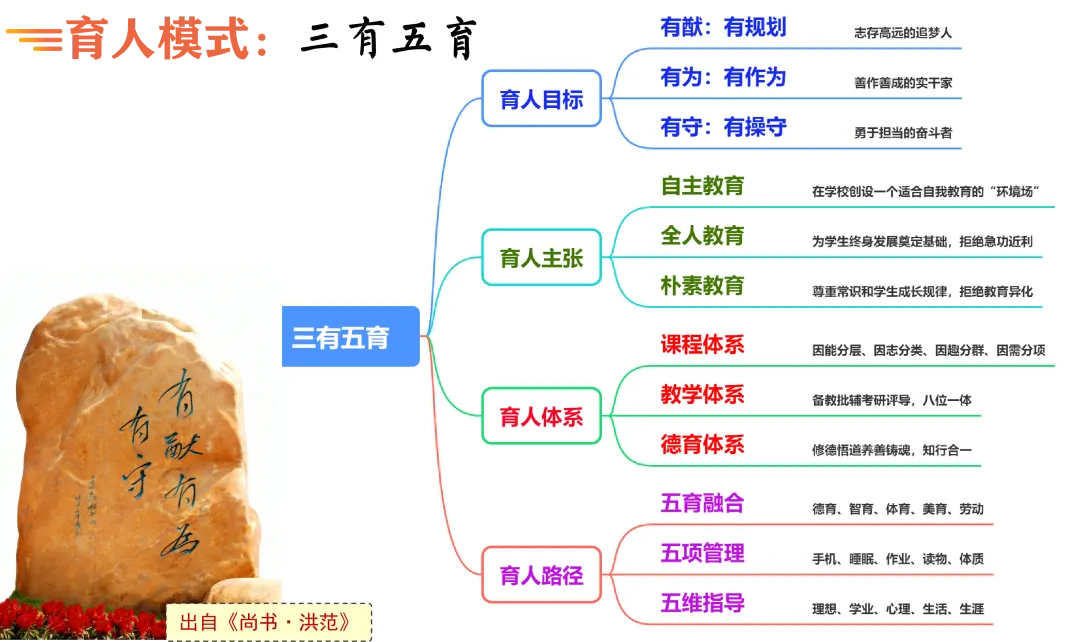 为落实立德树人根本任务,学校依托独具魅力的校园文化,以教育家精神推动教育强国建设,以规范管理促进学校高质量发展,打造了“三有五育”成长型育人模式。