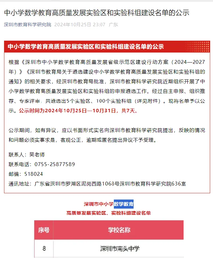 深圳市中小学数学教育高质量发展实验科组