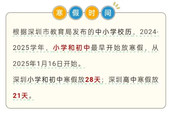 下一个假期除了元旦,之后就是等寒假了,深圳中小学寒假都放几天?目前教育局官方已经公布了时间。