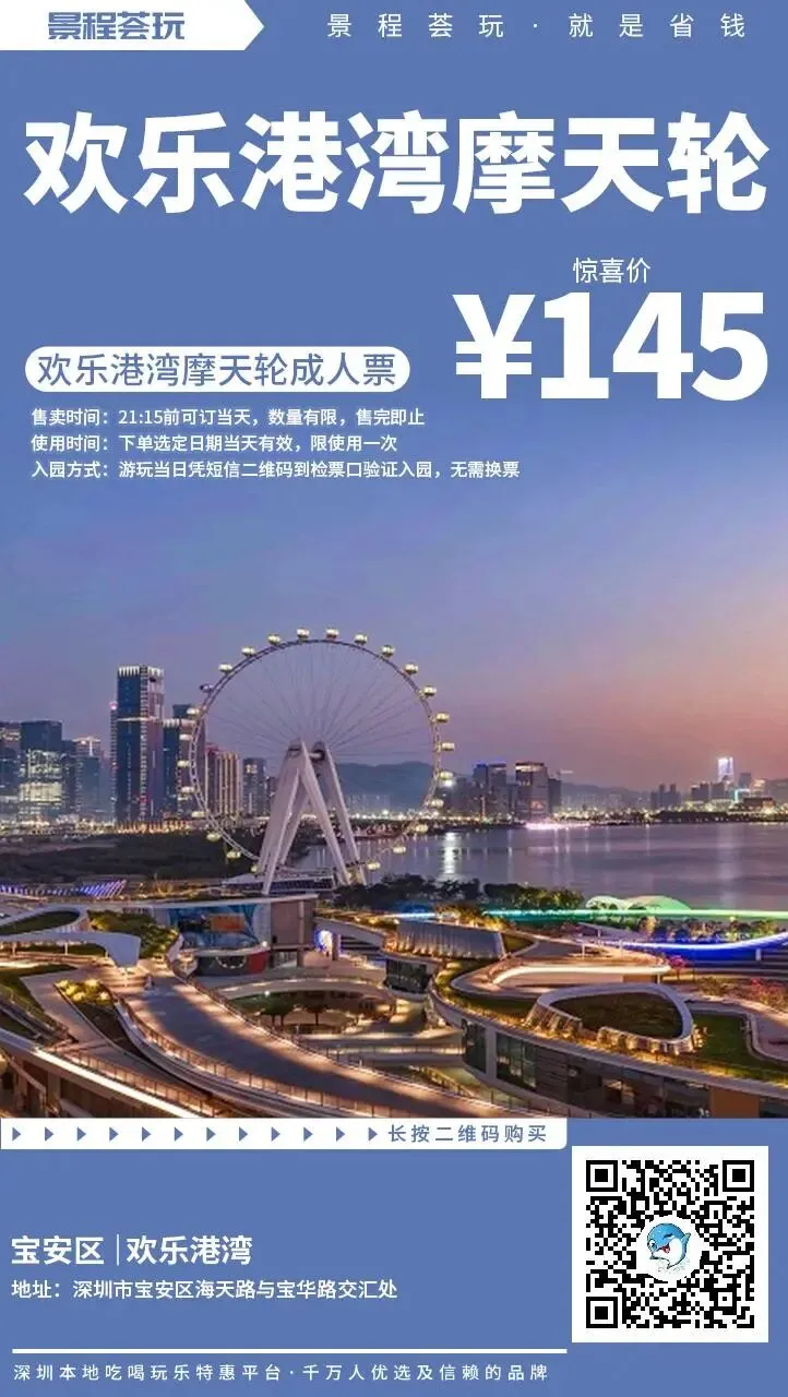 温馨提示:该门票不适用于以下游客:孕妇、心血管病患者(心脏病、高血压、低血压等)、恐高、酒醉、精神患者、行动不便及身体不适者请勿乘坐。【费用包含】深圳欢乐港湾摩天轮单人票1张(限乘坐1圈)