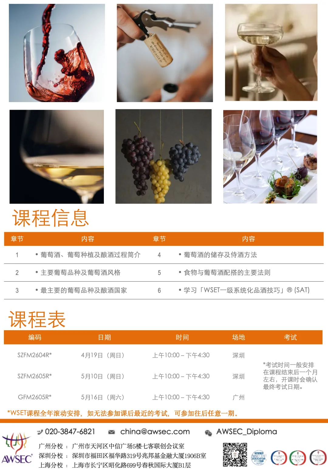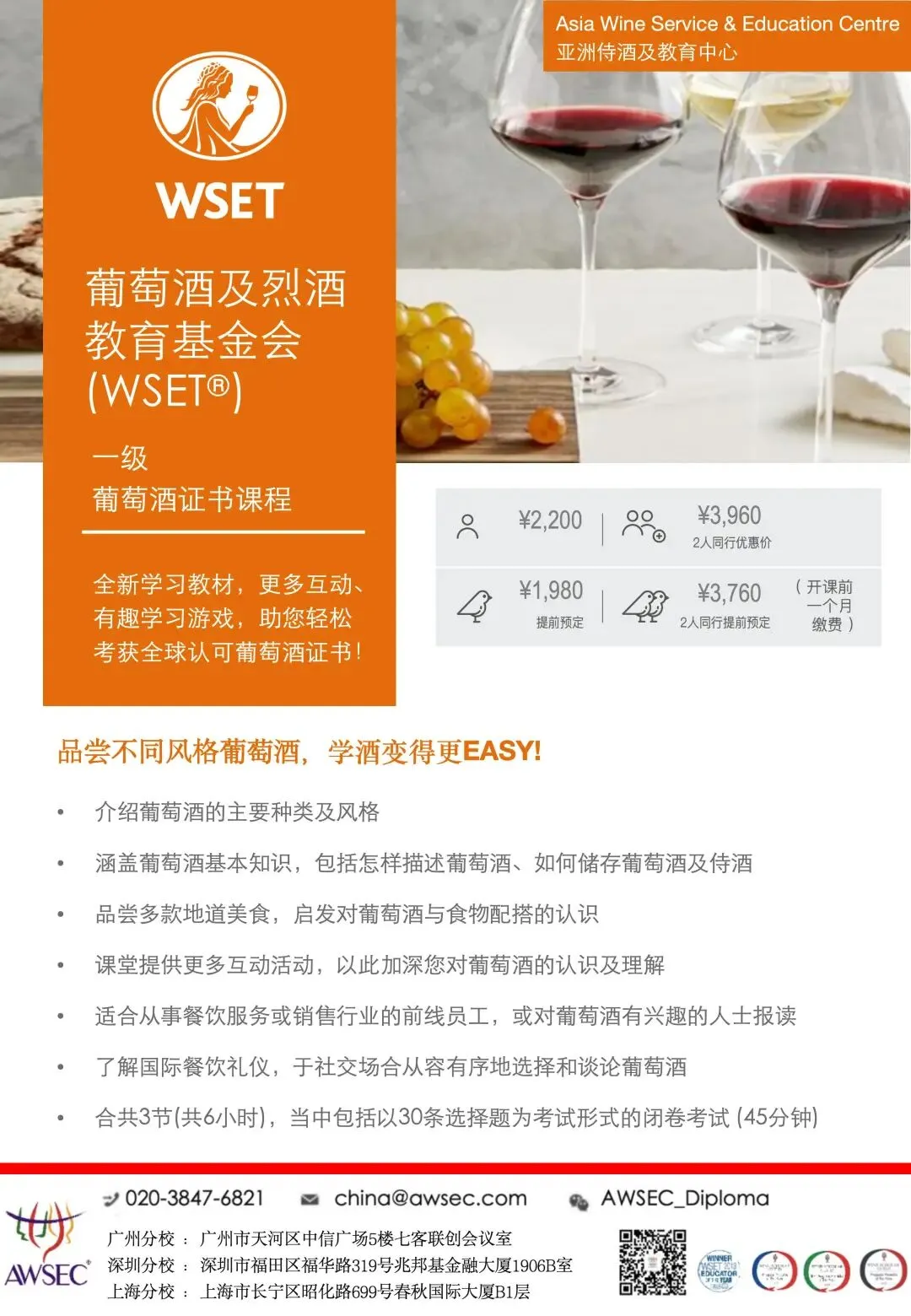 "WSET一级葡萄酒证书课程"介绍葡萄酒的主要类型和风格。本课程亦提供基础的葡萄酒知识,为葡萄酒爱好者或者餐饮 、零售行业新人提供专业的入门训练,循序渐进地介绍葡萄酒风格、存储、服务,及葡萄酒配餐。在AWSEC的一级葡萄酒课堂上,加强酒、起泡酒、甜酒等等都会有课堂品鉴,更好地巩固学员的入门知识。一系列的趣味味蕾感受环节,让你了解葡萄酒的甜度和酸度概念,深刻体会多种维度,并可以更好地与WSET二级及三级衔接。AWSEC课堂精心挑选具有风味代表性的特色美食,与各种葡萄酒搭配,与学员在实践中找到葡萄酒与美食搭配的乐趣,并轻松掌握葡萄酒与餐饮搭配的奥秘。葡萄酒概述和品酒方法