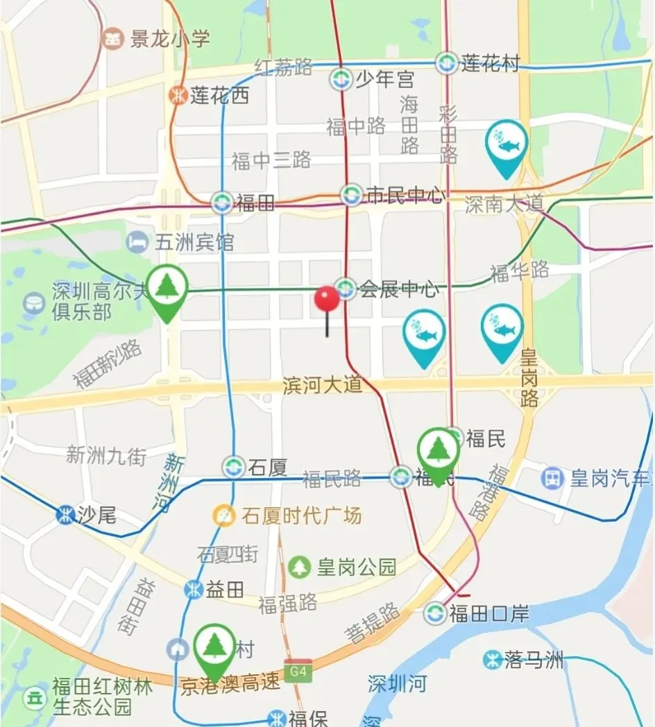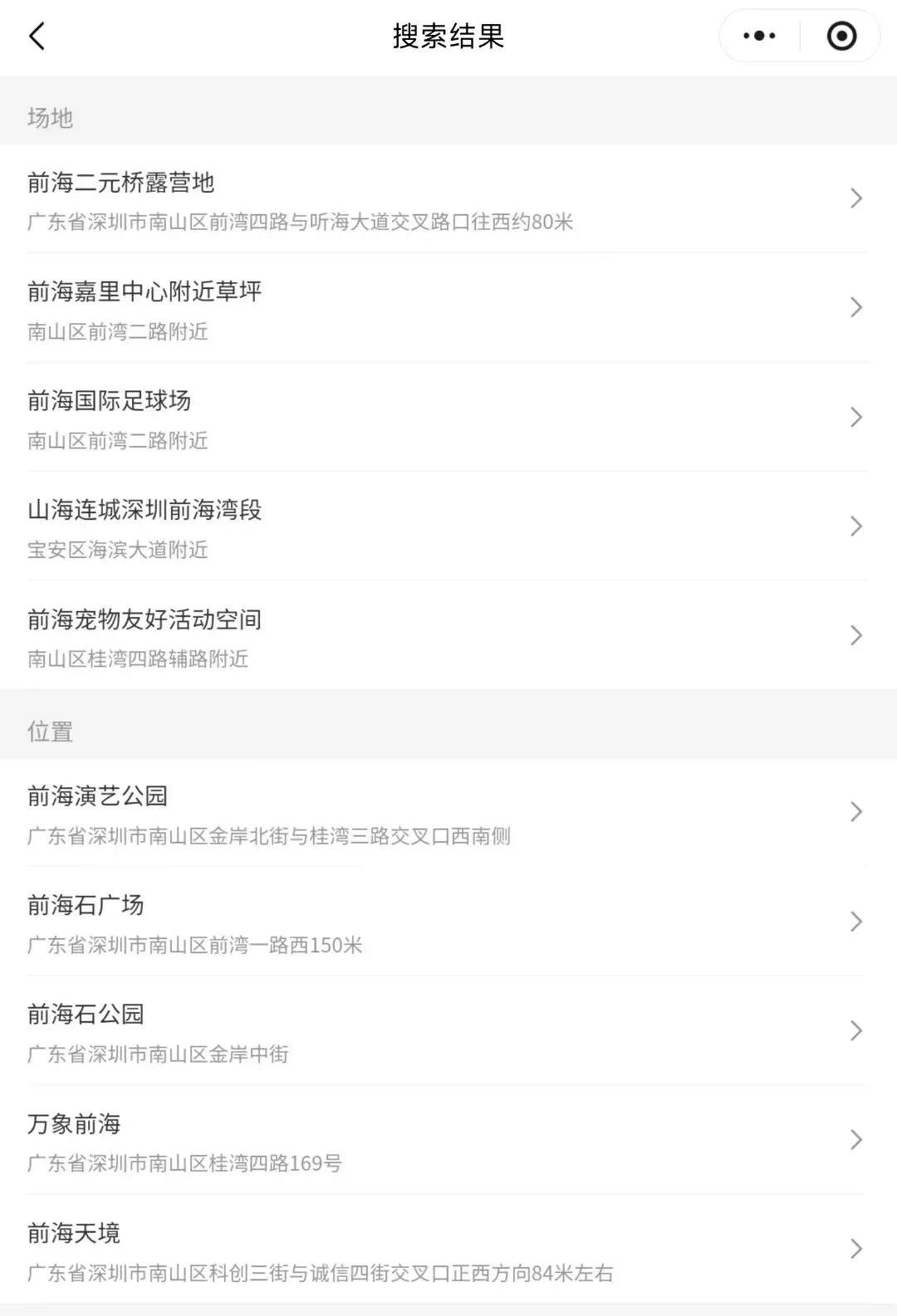 • 探索“前海”周边:列表为你筛选出地址含“前海”的具体地点。点击后,地图将以此为中心,展示周边20个地点供您选择