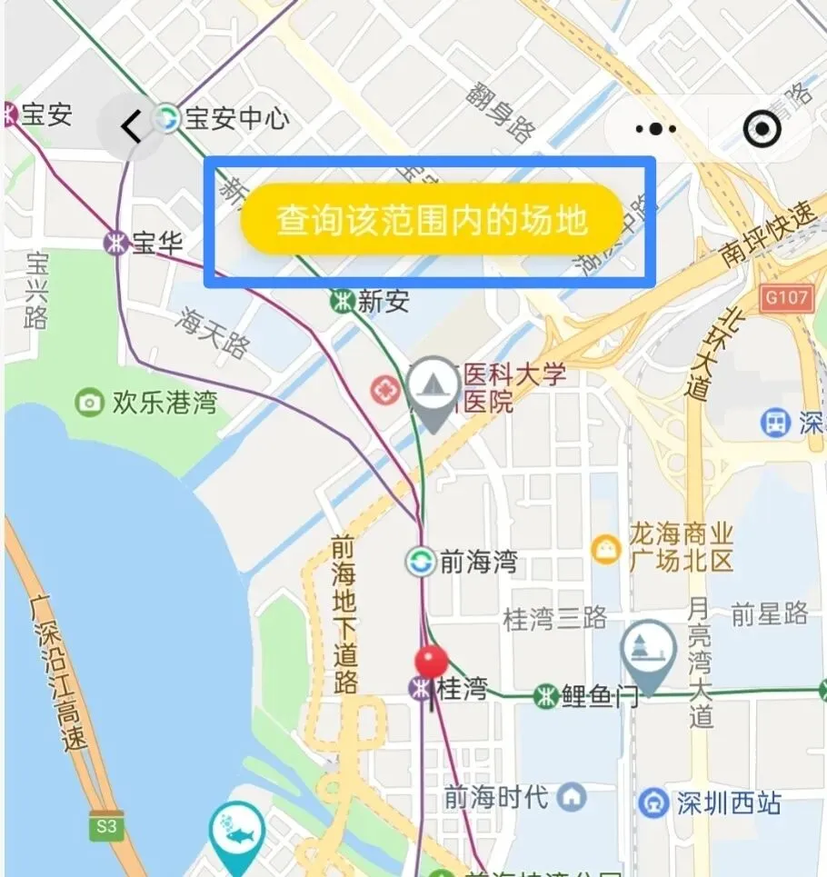 (3)如果你想寻找其他地方地点,可以拖拉地图,点击上方黄色图标【查询该范围内场地】,将会展示附近20个地点供你选择