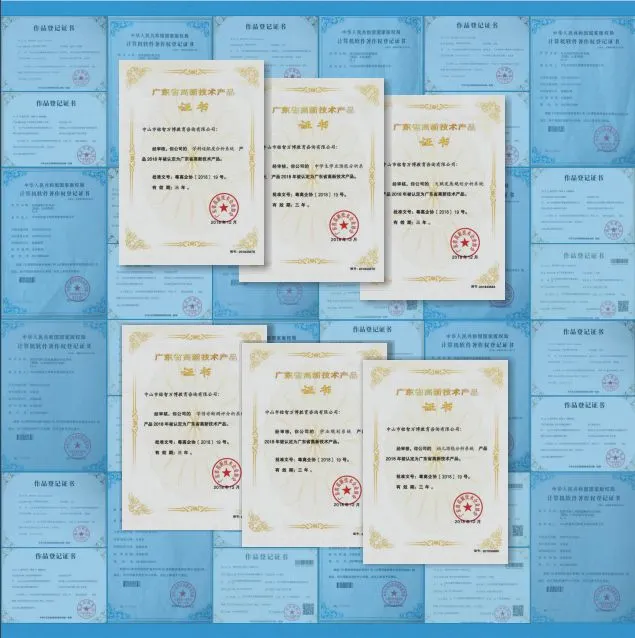 研发成果展示:6个高新技术产品证书、99项知识产权证书、5大系统平台