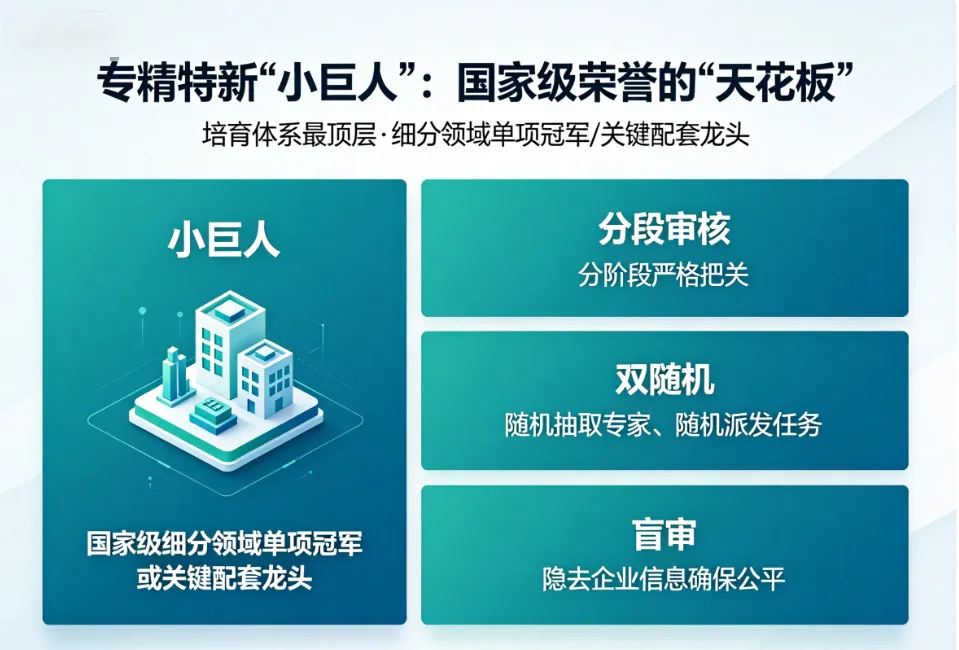 作为专精特新培育体系的最顶层,“小巨人”企业代表着国家级细分领域的单项冠军或关键配套龙头。今年的申报审核更是推出了“分段审核”、“双随机(随机抽取专家、随机派发任务)”和“盲审”等机制,力求绝对的公平公正。