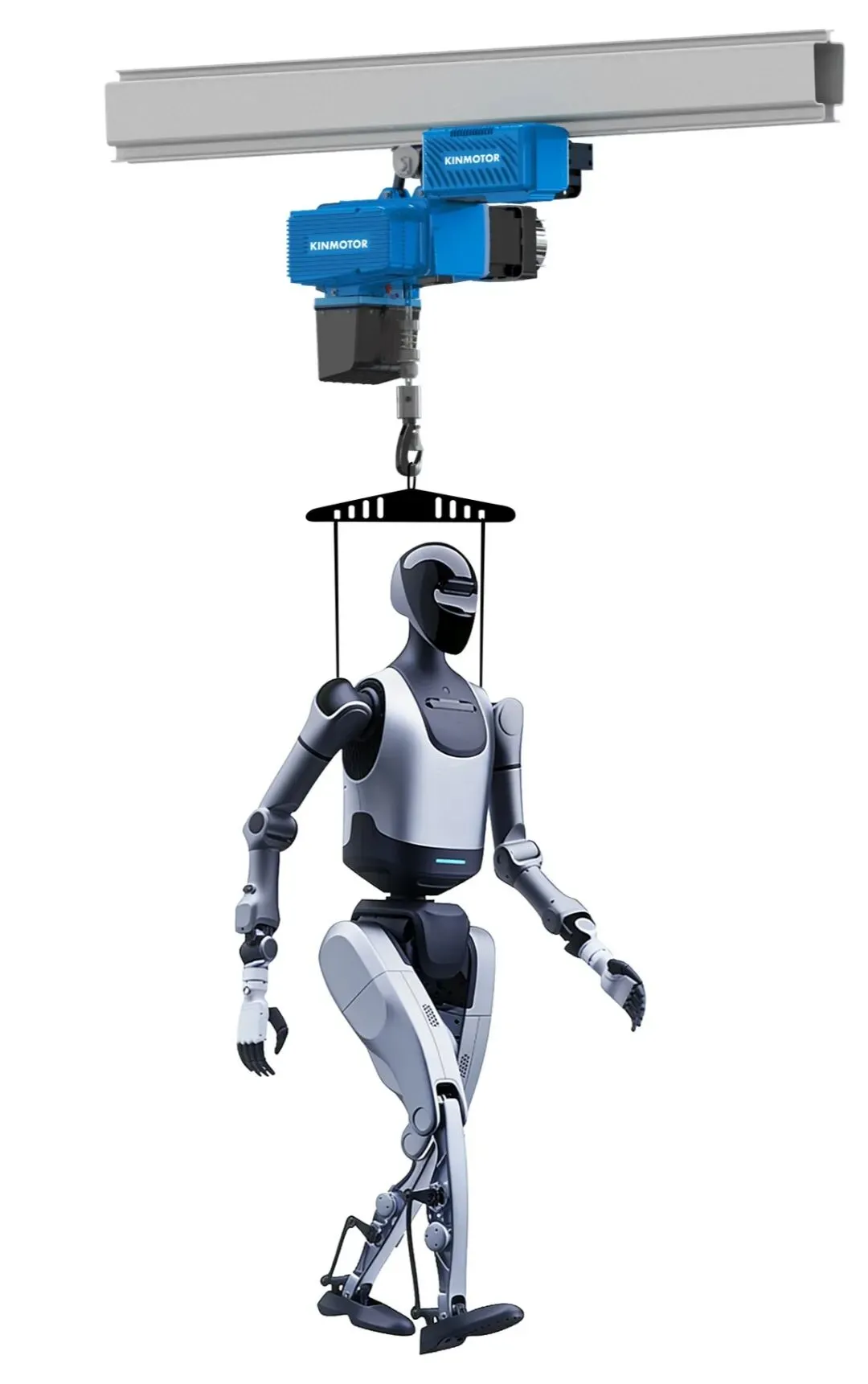 与传统起重设备不同,浙江金轴这套辅助系统搭载了自跟随模块。它不再需要人工遥控,而是能够主动感知人形机器人的运动意图,实时保持最佳跟随距离,真正做到“人形机器人走到哪里,起重系统就跟到哪里”。同时,它又不干涉机器人的自然步态与动作自由度,让研发人员可以获取最真实、最完整的运动数据。