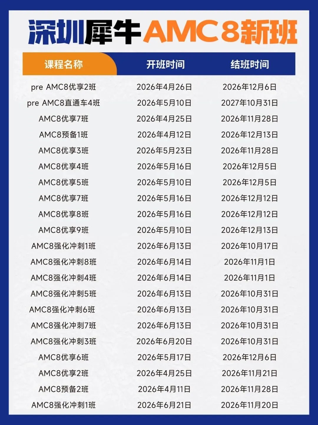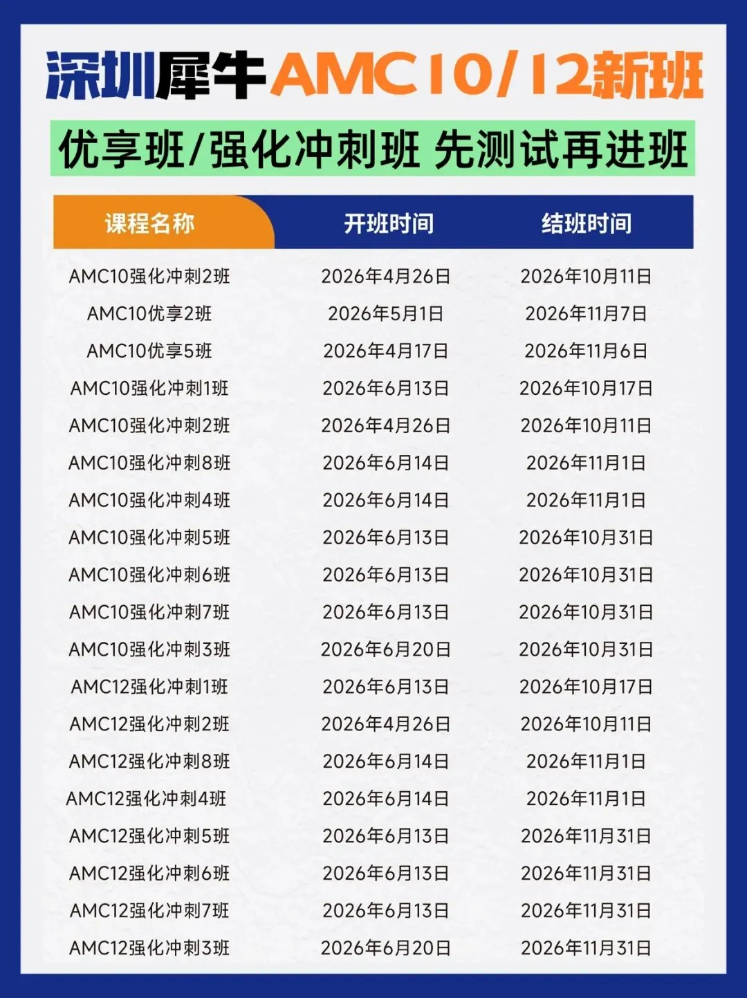 班型:130小时Pre-AMC10直通车、110小时AMC10直通车、80小时AMC10优享班、60小时AMC10强化冲刺班