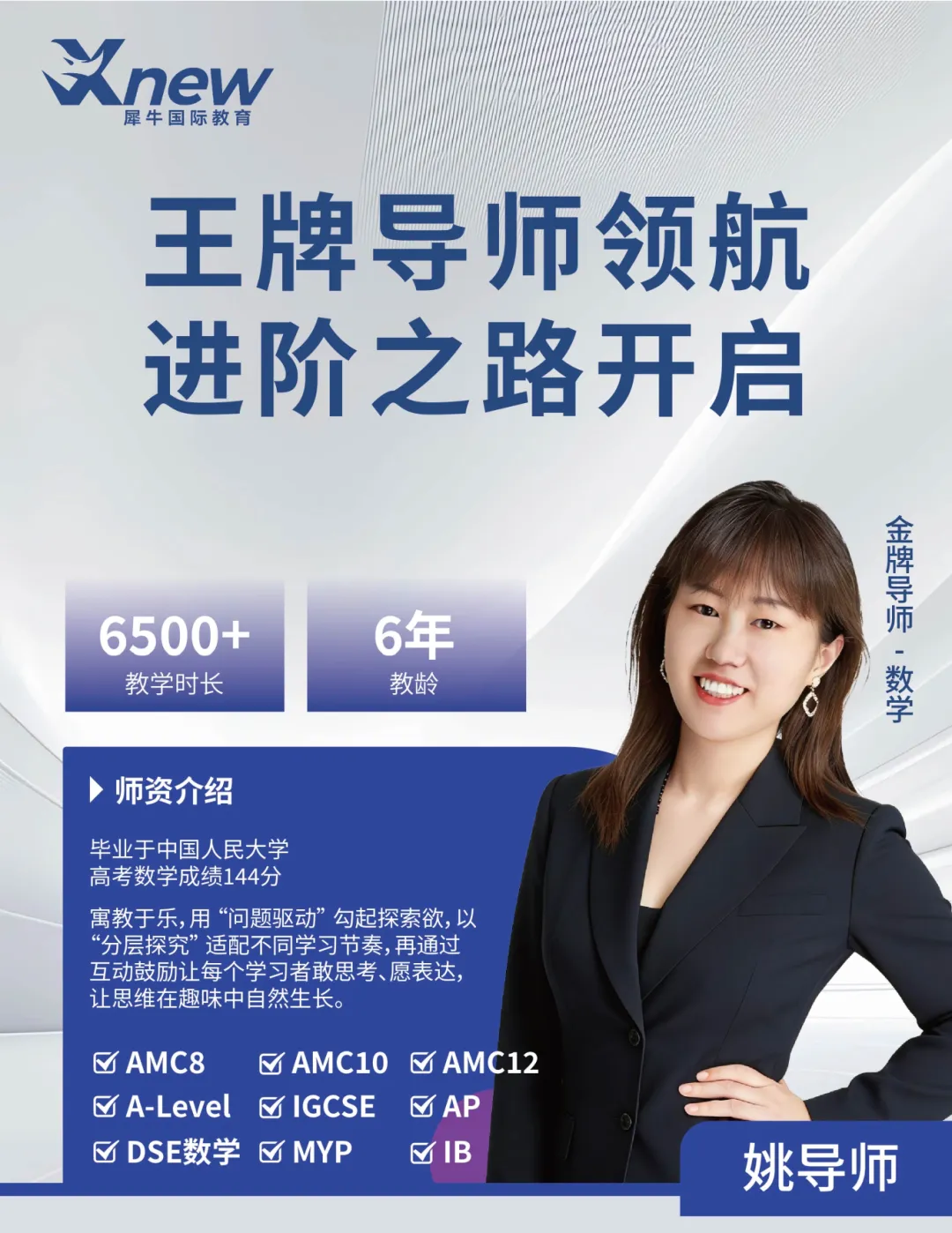 犀牛导师团队多来自清北复交、人大及英美名校,国际教育行业经验丰富,非常熟悉国际学科和竞赛考点及命题趋势,能够以轻松幽默的方式让学员快速理解知识点,并能够熟练运用。