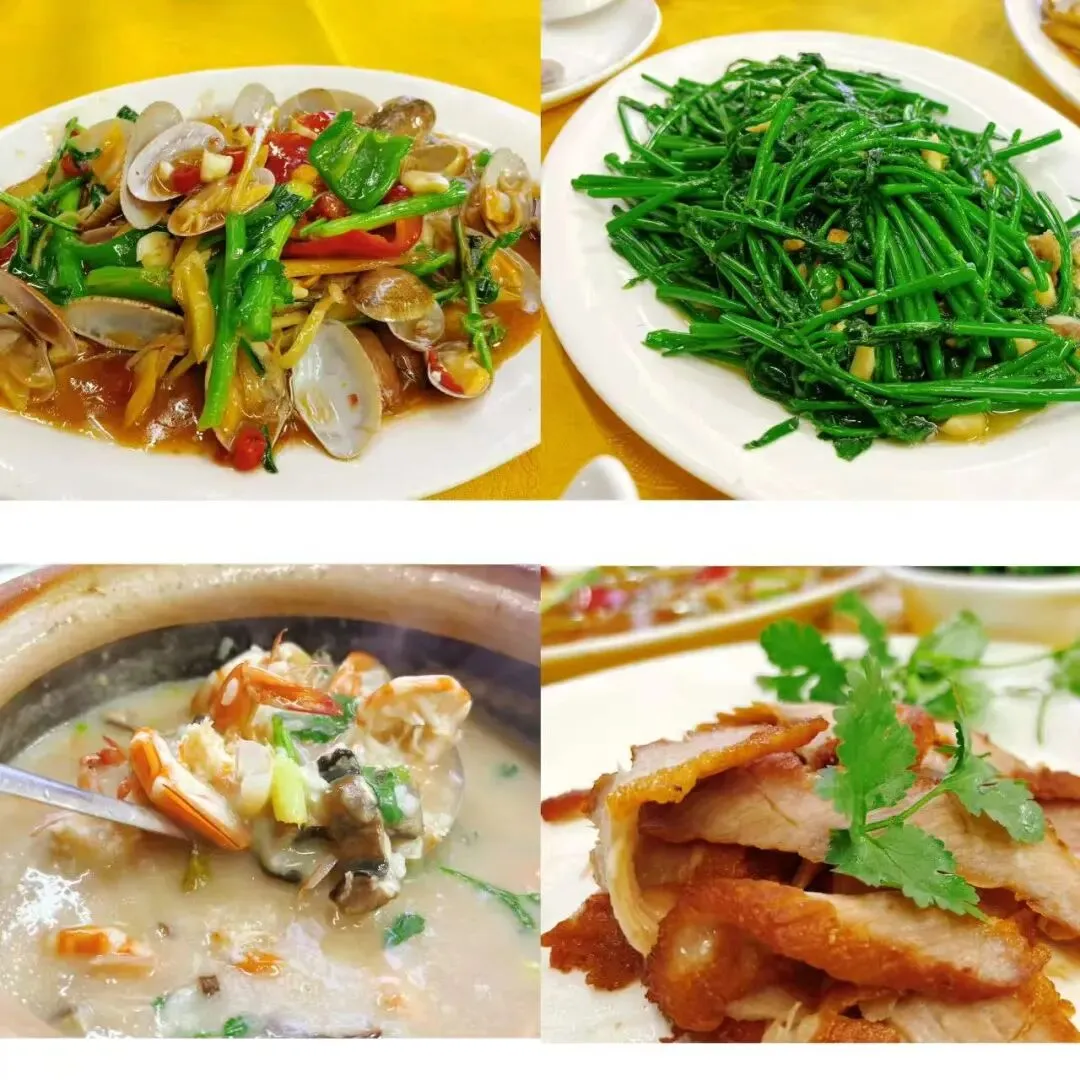晚餐:兄弟大排档⬆️泡了一天温泉,晚上就想喝点暖的。砂锅粥是主角,鲜掉眉毛;树仔菜脆嫩可口,炒花甲鲜滑。一家人围坐喝粥,吹着晚风,比大餐还舒服。