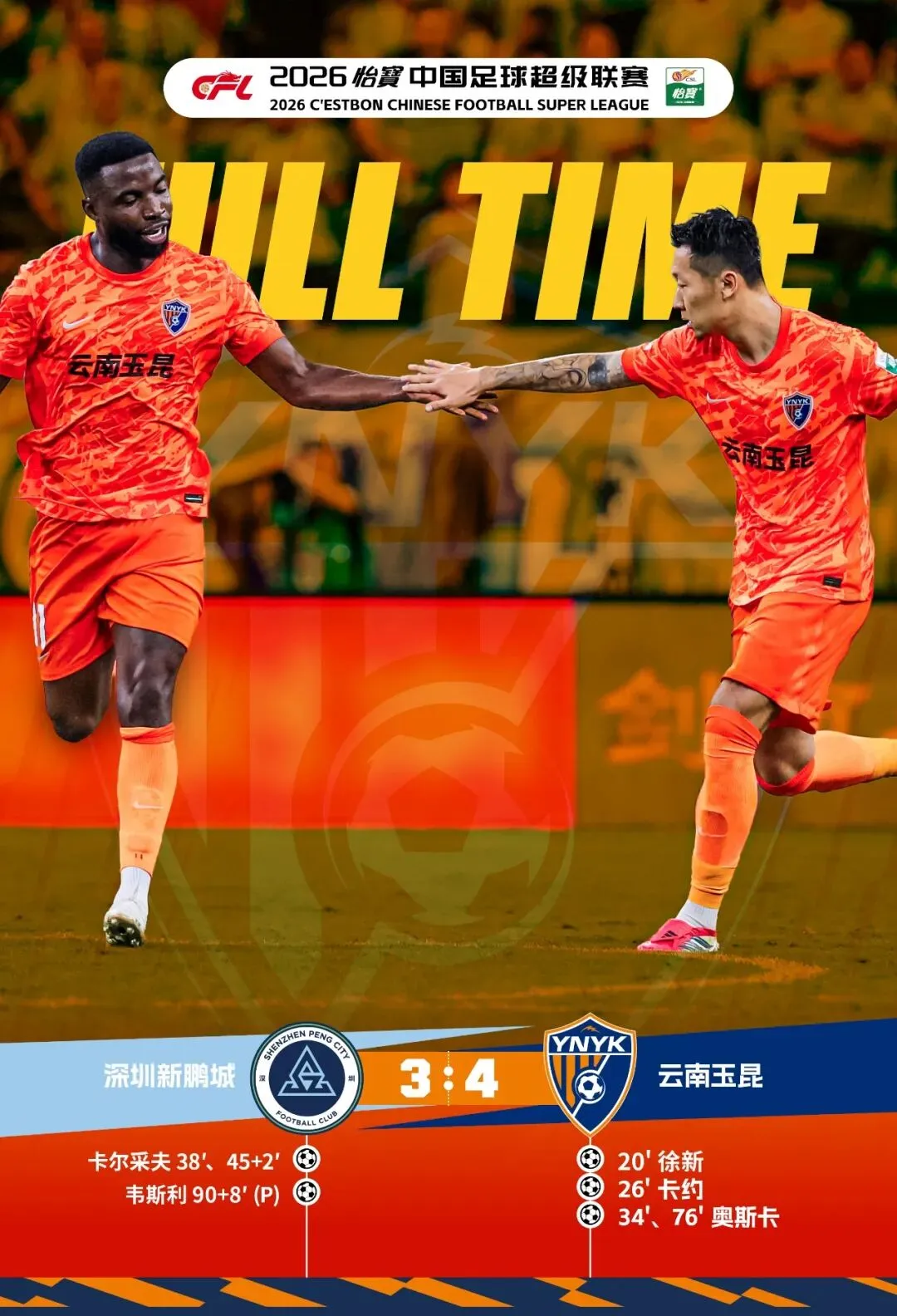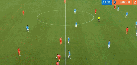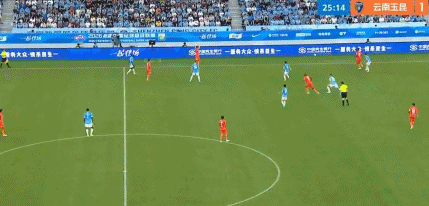 比赛第19分钟,云南玉昆打出精彩传控配合,8号徐新与7号叶楚贵进行撞墙配合后右脚打门,皮球应声入网,徐新斩获玉昆生涯首球,玉昆1:0领先。第26分钟,云南玉昆在深圳新鹏城禁区前沿形成压迫,深圳后卫不慎回传失误,10号约尼查送出精妙直塞,34号卡约突入禁区后打远角得手,经VAR裁定进球有效,场上比分被改写为2:0。第33分钟,深圳后卫杨一鸣中场拉拽玉昆外援奥斯卡,破坏玉昆反击机会,杨一鸣被主裁出示黄牌警告。1分钟后,玉昆10号约尼查中场区域任意球送出精准长传,11号奥斯卡快速插上头球破门,收获个人赛季第4粒进球,玉昆3:0领先深圳新鹏城。
